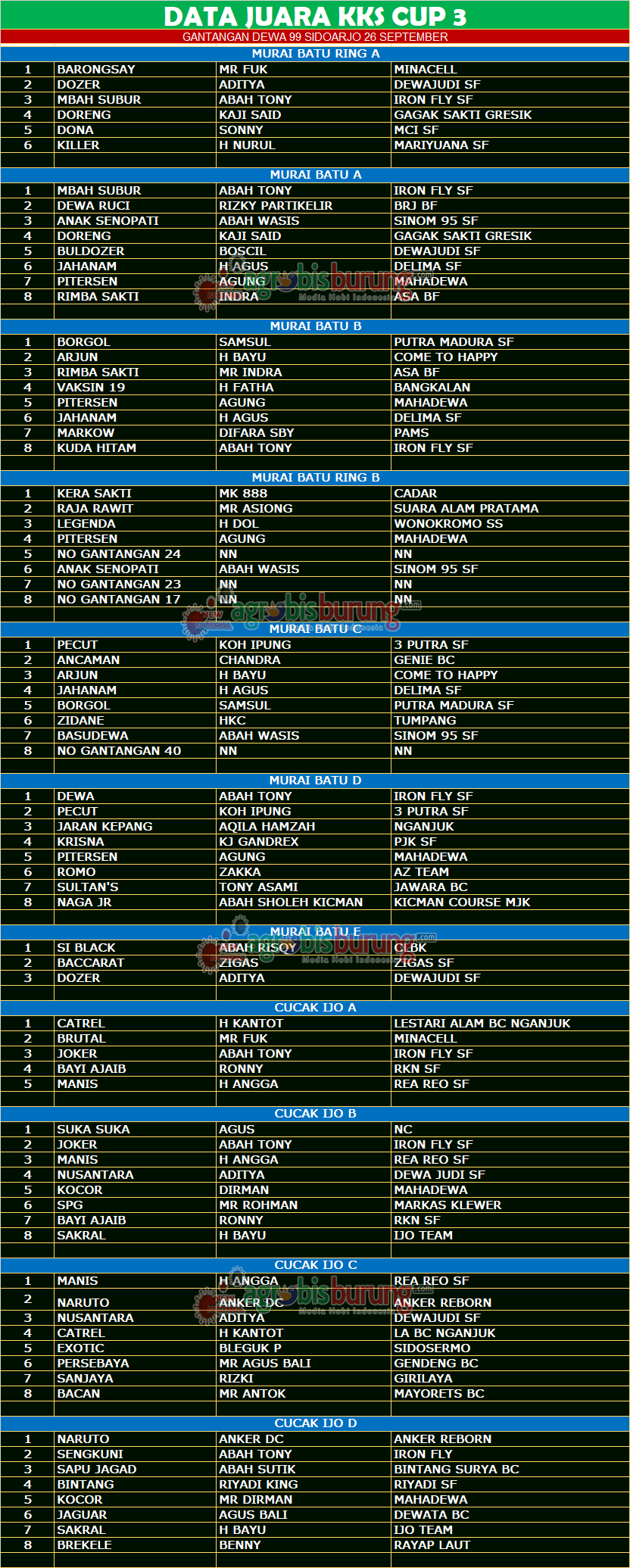 Headline Hobi Burung Juara Kicauan Kicauan Organizer Profil Data Juara KKS Cup 3 di Gantangan Dewa 99 Sidoarjo, Minggu 26 September agrobisburung 27 September 2021 SIDOARJO, agrobisburung.com – Data Juara KKS Cup 3 di Gantangan Dewa 99 Sidoarjo, Minggu 26 September Tinggalkan Komentar Post navigation Previous: H Yusuf NS Pemilik Was Bf Sampang Boyong Adik Legendaris dan Trah lainnya di Atlas BFNext: MB Comando Cetak Hattrick Di Road To B16 Cup II Karawang More Stories Headline Juara Perkutut Semakin Seru, Jawara Sultan Larligi & Angin Malam Moncer Dipodium Utama Latihan Dinilai Kebumen #2 Cup 2026 agrobisburung 24 Januari 2026 Headline Juara Perkutut Pemanasan Jelang Pembukaan LPJB 2026, Unicorn Naik Kelas & Cirebon Trusmi Ngorbit di Liga Kopi Luhur #6 (Penutupan Poin) Cirebon agrobisburung 18 Januari 2026 Headline Hobi Lain Juara Perkutut Jawara Airlanga Moncer Bareng bersama Antsena & Mr M-307 Di Latihan Dinilai Tarkam Galaxy Gresik agrobisburung 18 Januari 2026
