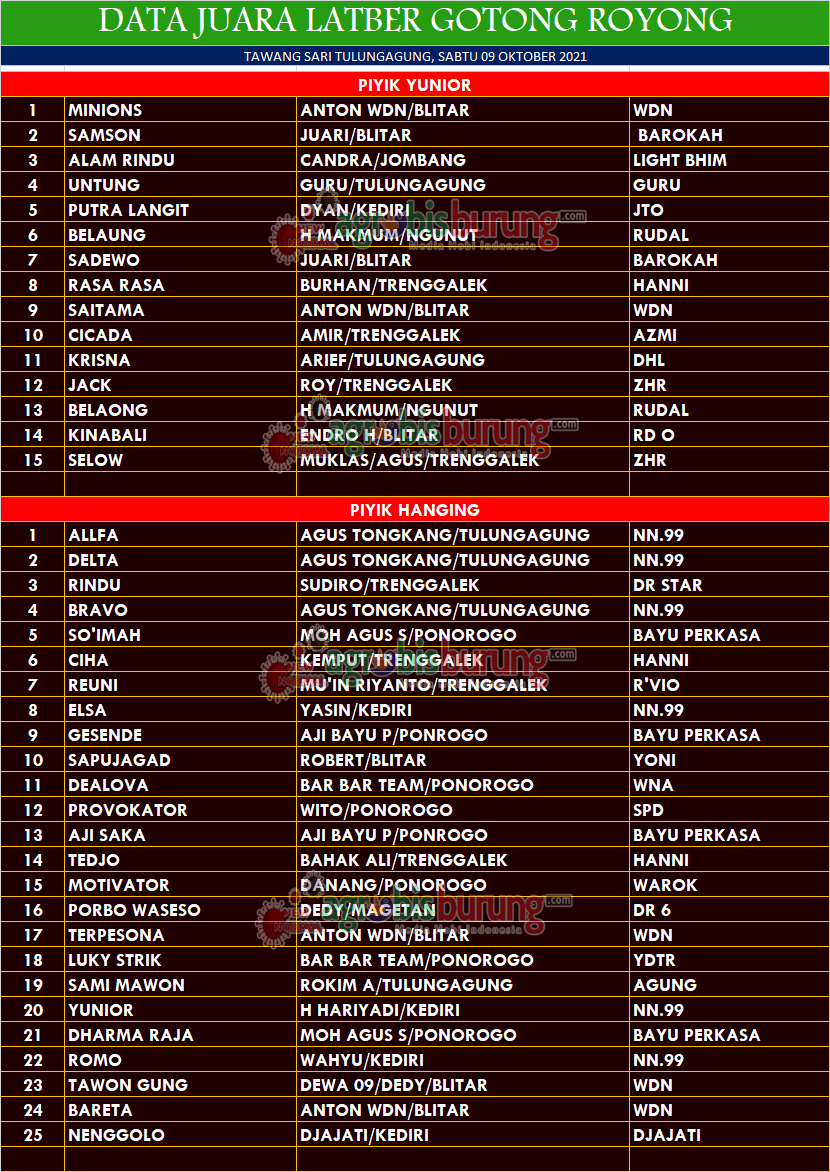 Sementara itu jalannya lomba yang memainkan 2 kelas lomba langsung menjadi arena pamer kehebatan dua jawara muda yang memiliki bakat, di piyik yunior debutan Minions bergelang EDN Blitar yang dikawal sang pemilik Anton WDN langsung bikin gebrakan sejak babak awal. Minions benar benar merajai dikelasnya setelah perolehan poinnya leading sejak awal. Dan di kelas piyik hanging duo jawara milik Agus Tongkang Tulungagung yang sama sama bergelang NN.99 BF langsung merebut dua posisi utama di kelas tersebut, Allfa & Beta tak memberi ruang gerak untuk lawan lawannya yang harus puas berada di posisi kejuaraan. AB-ATO/end