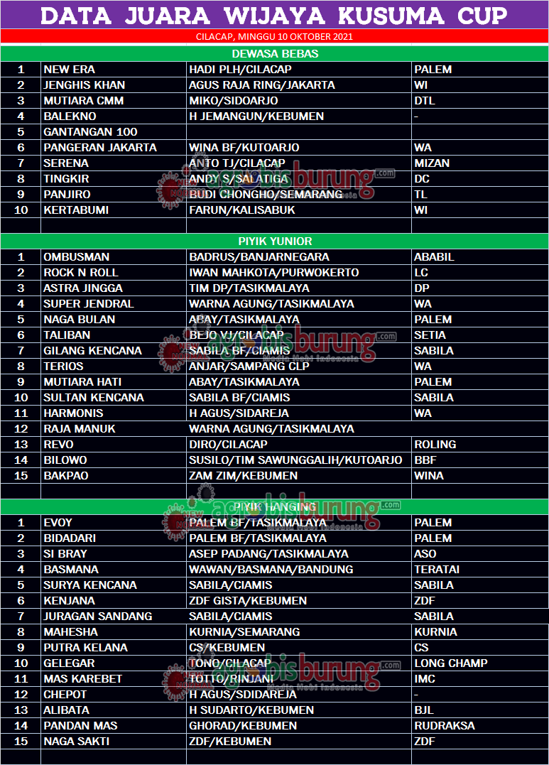 Headline Hobi Burung Perkutut Data Juara Konkurs Wijaya Kusuma Cup di Cilacap, Minggu 10 Oktober agrobisburung 11 Oktober 2021 CILACAP, agrobisburung.com – Data Juara Konkurs Wijaya Kusuma Cup di Cilacap, Minggu 10 Oktober Tinggalkan Komentar Post navigation Previous: Si Persib & Werkudoro Ngorbit, Idolaku Tangguh di Latber Pemanasan Pengda Cup Kab. Bandung (17/10) Sekaligus Pengenalan Lapangan Baru Soreang Next: Disambut Antusias Kungmania Ciayumajakuning, Megaloman Naik Kelas, Jatiwangi & Terpesona Ngorbit di Latber HUT TNI ke-76 Cirebon Wilbar More Stories Headline Perkutut Profil “Double” Transaksi Spektakuler : Akhirnya Jawara Palestine Andalan H. Handang Semarang di-Take Over Hendry WAT Tasikmalaya & K-WAT Delon Dijebol Sandy ITP agrobisburung 15 Januari 2026 Headline Perkutut Profil Golsindo BF Jakarta Rilis Formasi Kandang 2026, Andalkan Materi Indukan Terbaik, Siap Cetak Perkutut Kualitas Lomba dengan Bobot Suara Istimewa agrobisburung 14 Januari 2026 Headline Perkutut Profil Nunu Depok “Turun Gunung” Langsung Borong 5 Pasang K-Unggulan WAT BF Tasikmalaya, H. Pendi Nadira Jakarta Jebol K-WAT Brahmana & BDB BF Lombok Jebol K-WAT Raja Ampat agrobisburung 13 Januari 2026