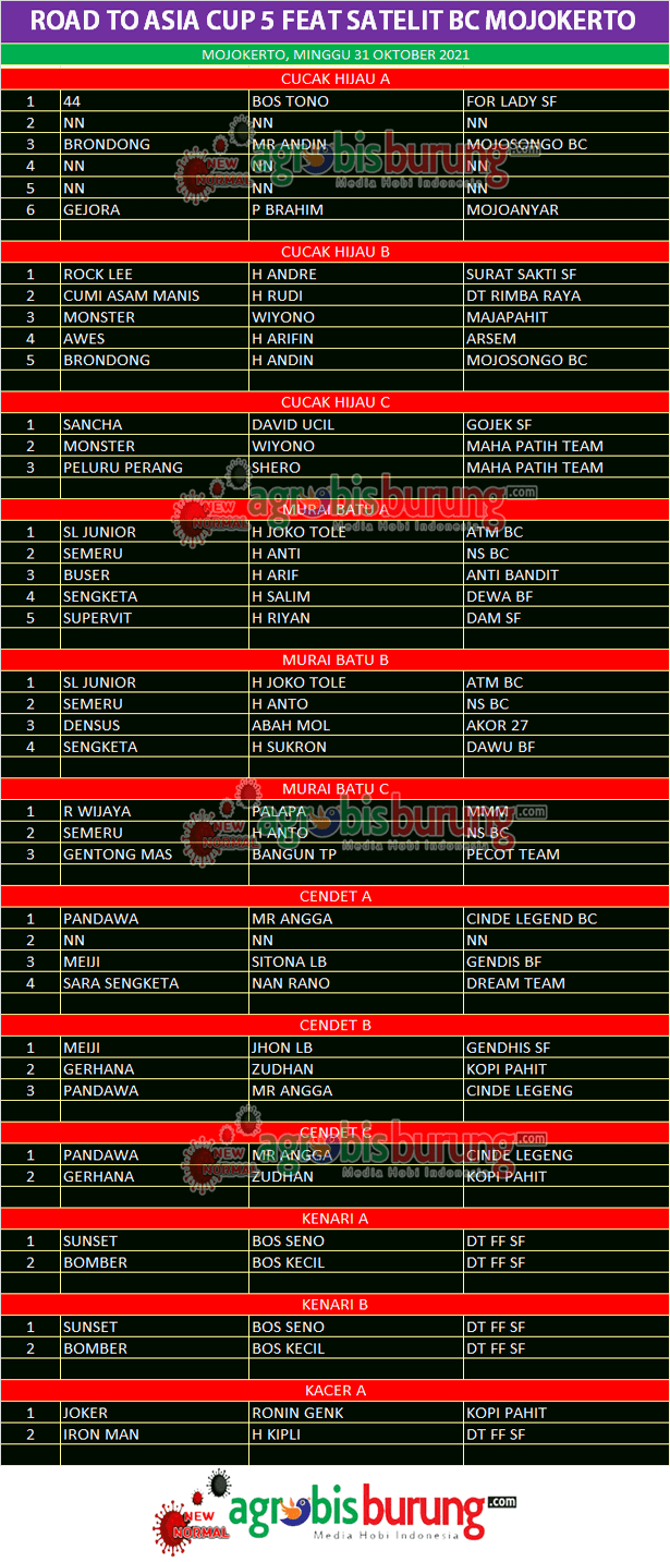 Headline Hobi Burung Juara Kicauan Kicauan Organizer Profil Data Juara Road Asia Cup 5 Feat Satelit BC di Mojokerto, Minggu 31 Oktober agrobisburung 1 November 2021 MOJOKERTO, agrobisburung.com – Data Juara Road Asia Cup 5 Feat Satelit BC di Mojokerto, Minggu 31 Oktober Tinggalkan Komentar Post navigation Previous: Data Juara Konkurs Mr Yos Viona Cup II 2021 di TMII Jakarta, Minggu 31 OktoberNext: Suntik Indukan Ciamik, Kades Susangka Sakura Bf boyong Bapak Syahrini (Nada) dari Taufan MG dengan harga ciamik More Stories Headline Perkutut Profil Tambah Amunisi & Trah Ciamik H Iwan TS Jombang Boyong Produk Grand Master Dan LY BF Surabaya agrobisburung 28 November 2025 Headline Juara Perkutut Profil H Pendi Nadira Jakarta Terus Kembangan Trah Jawara Import-Lokal Pilihan Terbaik, Jebol K-WAT BTC-Hongkong-Tesla dari WAT BF Tasikmalaya dengan Transaksi Istimewa agrobisburung 28 November 2025 Headline Perkutut Profil Daftar Bookingan K-WAT Slipknot Terus Bertambah, H. Sunan RJL Cilacap & Kok Tong Hollywood Lombok Masuk Antrian 3-4, Hendry WAT Tasikmalaya Batasi Sampai Bookingan Kelima agrobisburung 25 November 2025