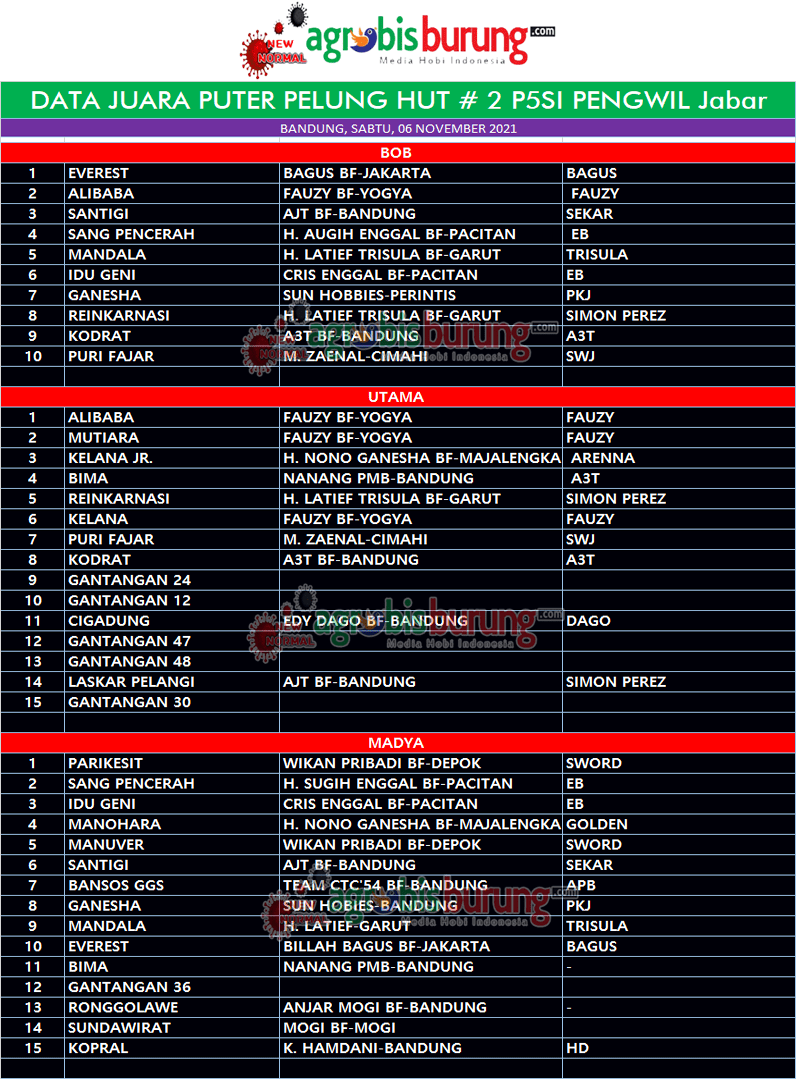 Derkuku-Puter Derkuku-Puter Headline Hobi Burung Juara Organizer Profil Data Juara Puter Pelung HUT # 2 P5SI Pengwil Jabar di Bandung, Sabtu 06 November agrobisburung 8 November 2021 BANDUNG, agrobisburung.com – Data Juara Puter Pelung HUT # 2 P5SI Pengwil Jabar di Bandung, Sabtu 06 November Tinggalkan Komentar Post navigation Previous: Dihadiri Ketua Pengwil Jatim Eko Prasetyo resmi Jadi ketua Pengda, Alifa jadi yang terbaik di Piala pengda Magetan #1 2021Next: Everest Jawara BOB, Fauzy Mendominasi, Parikesit Eksis, Debut H. Latief Trisula Orbitkan Produk Sendiri di HUT P5SI Pengwil Jabar More Stories Headline Perkutut Profil Hendry Sobbandi : “Pemula Perkutut Tak Perlu Bingung dalam Memilih Burung Berkualitas, Fokus Saja pada Karakter Suara !” agrobisburung 27 Februari 2026 Headline Juara Perkutut WAT BF Tasikmalaya “Upgrade” Formasi Kandang Secara Berkala untuk Tingkatkan Kualitas Produksi, Daftar Bookingan Merata & Stok Anakan Selalu “Sold Out” agrobisburung 25 Februari 2026 Headline Organizer Perkutut Hasil Musda Jombang 2026, Agung Hariadi Terpilih Jadi Ketua Baru Pengda Jombang Secara Aklamasi & Siap Lanjutkan Program Ketua Lama agrobisburung 20 Februari 2026