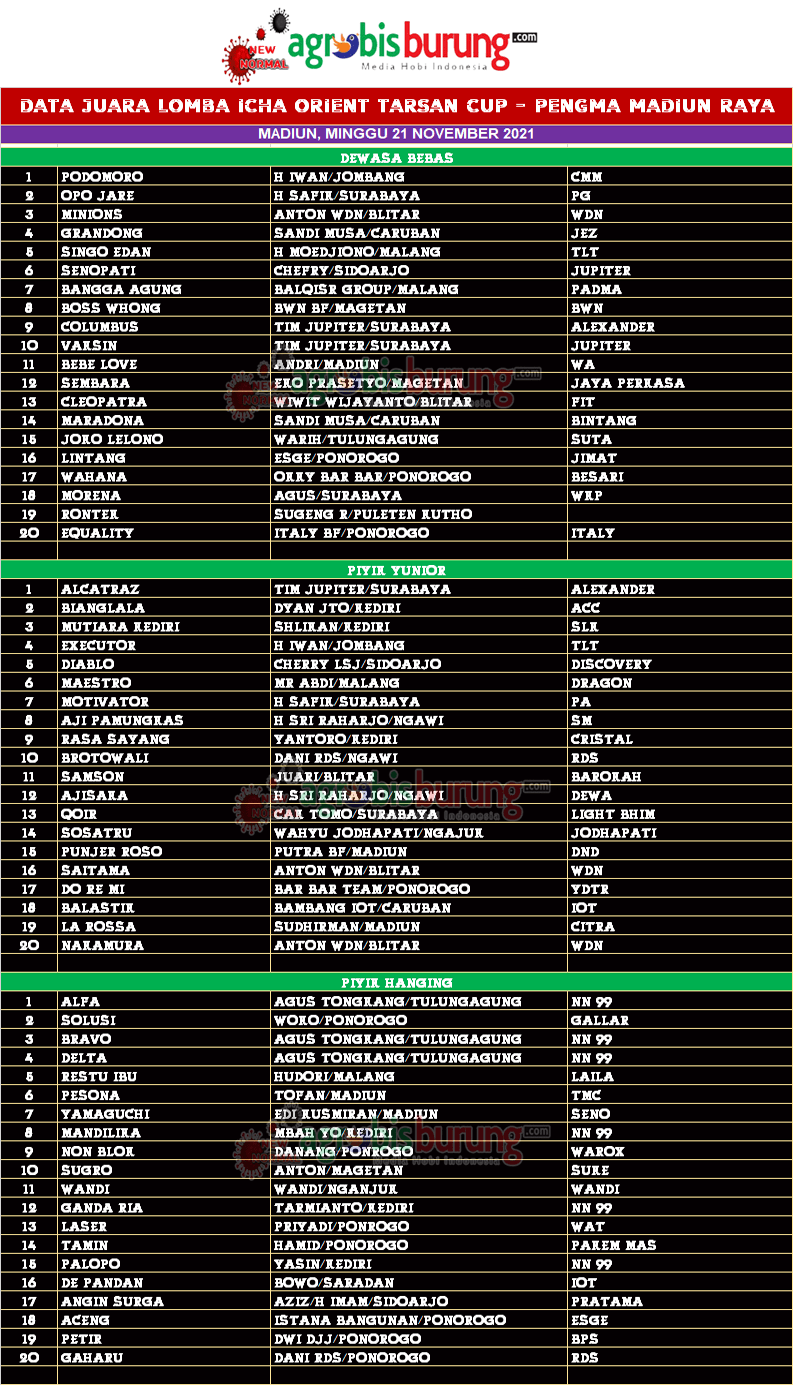 MADIUN, agrobisburung.com – Data Juara Lomba Pengda Madiun Raya – Icha Orient Tarsan Cup, Minggu 21 November