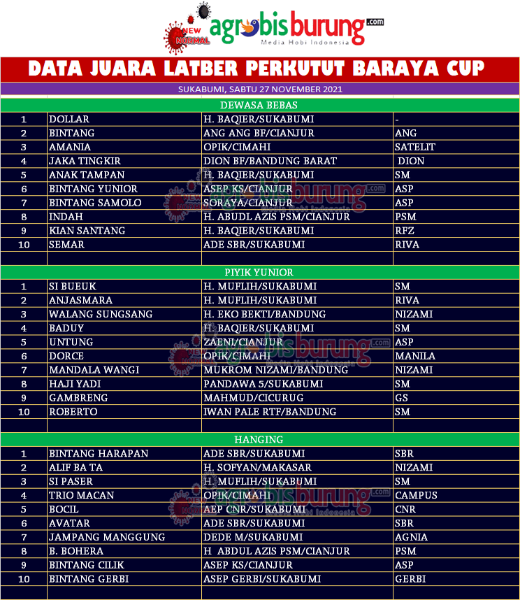 Headline Hobi Burung Juara Organizer Perkutut Perkutut Profil Data Juara Latber Perkutut Baraya Cup 2021 di Sukabumi, Sabtu 27 November agrobisburung 28 November 2021 Dihadiri para tokoh kungmania Sukabumi SUKABUMI, agrobisburung.com – Data Juara Latber Perkutut Baraya Cup 2021 di Sukabumi, Sabtu 27 November Tinggalkan Komentar Post navigation Previous: New Up-Date Data Pemesan Tiket Piala Raja 2021 di Prambanan, Minggu 28 NovemberNext: Selain Diwarnai Aksi Borong Tropi, Duta Pasundan Bareng Joki Asor Keluar Sebagai Juara Umum Bung Tomo Cup IV More Stories Headline Perkutut Profil Tambah Amunisi & Trah Ciamik H Iwan TS Jombang Boyong Produk Grand Master Dan LY BF Surabaya agrobisburung 28 November 2025 Headline Juara Perkutut Profil H Pendi Nadira Jakarta Terus Kembangan Trah Jawara Import-Lokal Pilihan Terbaik, Jebol K-WAT BTC-Hongkong-Tesla dari WAT BF Tasikmalaya dengan Transaksi Istimewa agrobisburung 28 November 2025 Headline Perkutut Profil Daftar Bookingan K-WAT Slipknot Terus Bertambah, H. Sunan RJL Cilacap & Kok Tong Hollywood Lombok Masuk Antrian 3-4, Hendry WAT Tasikmalaya Batasi Sampai Bookingan Kelima agrobisburung 25 November 2025