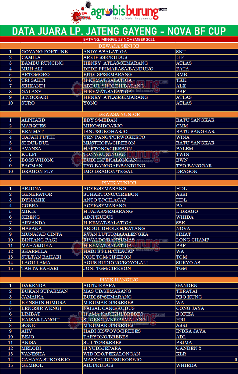 Headline Hobi Burung Juara Organizer Perkutut Perkutut Profil Data Juara LP Jateng Gayeng – NOva BF Cup 2021 di Batang, Minggu 28 November agrobisburung 28 November 2021 BATANG, agrobisburung.com – Data Juara LP Jateng Gayeng – NOva BF Cup 2021 di Batang, Minggu 28 November Tinggalkan Komentar Post navigation Previous: Data Juara Padjajaran Cup 2021 di Bogor, Minggu 28 NovemberNext: Mahaputra, Bianglala & Prabu Tampil Perkasa di Latber GR HUT Kab Tulungagung ke-816 More Stories Headline Perkutut Profil Tambah Amunisi & Trah Ciamik H Iwan TS Jombang Boyong Produk Grand Master Dan LY BF Surabaya agrobisburung 28 November 2025 Headline Juara Perkutut Profil H Pendi Nadira Jakarta Terus Kembangan Trah Jawara Import-Lokal Pilihan Terbaik, Jebol K-WAT BTC-Hongkong-Tesla dari WAT BF Tasikmalaya dengan Transaksi Istimewa agrobisburung 28 November 2025 Headline Perkutut Profil Daftar Bookingan K-WAT Slipknot Terus Bertambah, H. Sunan RJL Cilacap & Kok Tong Hollywood Lombok Masuk Antrian 3-4, Hendry WAT Tasikmalaya Batasi Sampai Bookingan Kelima agrobisburung 25 November 2025