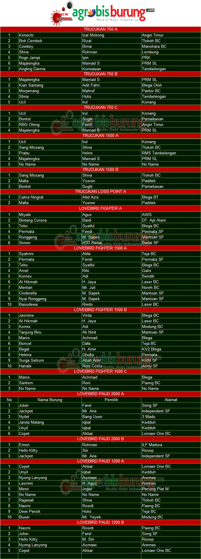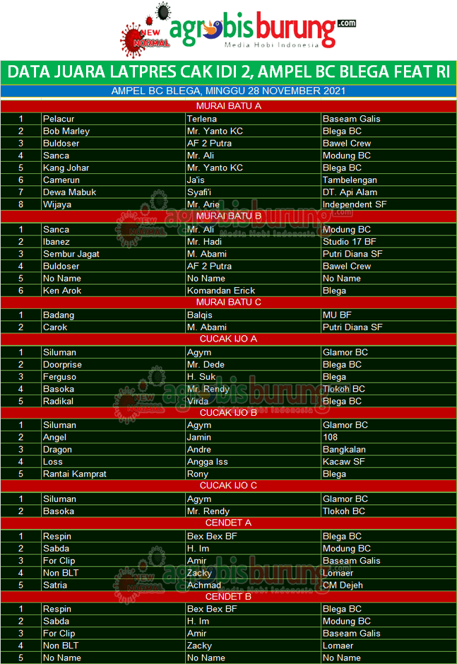 BLEGA, agrobisburung.com-  Data Juara Latpres Cak DI # 2 di Gantangan Ampel BC Feat RI, Minggu 28 November