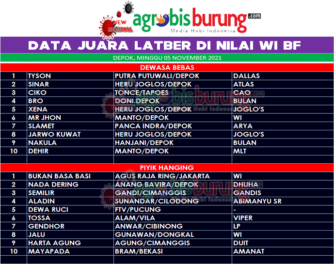 Di dewasa bebas, Tyson bergealng Dallas milik Putra Putuwali Depok menjadi yang terbaik dan berhak naik podium pertama, Sinar bergelang Atlas dan Ciko bergelang CAO behak podium kedua dan ketiga. Sementara di kelas piyik hanging, debutan gres milik Agus Raja Ring bernama Buka Basa Basi bergelang WI menjadi terbaik pertama. AB-ERU/END