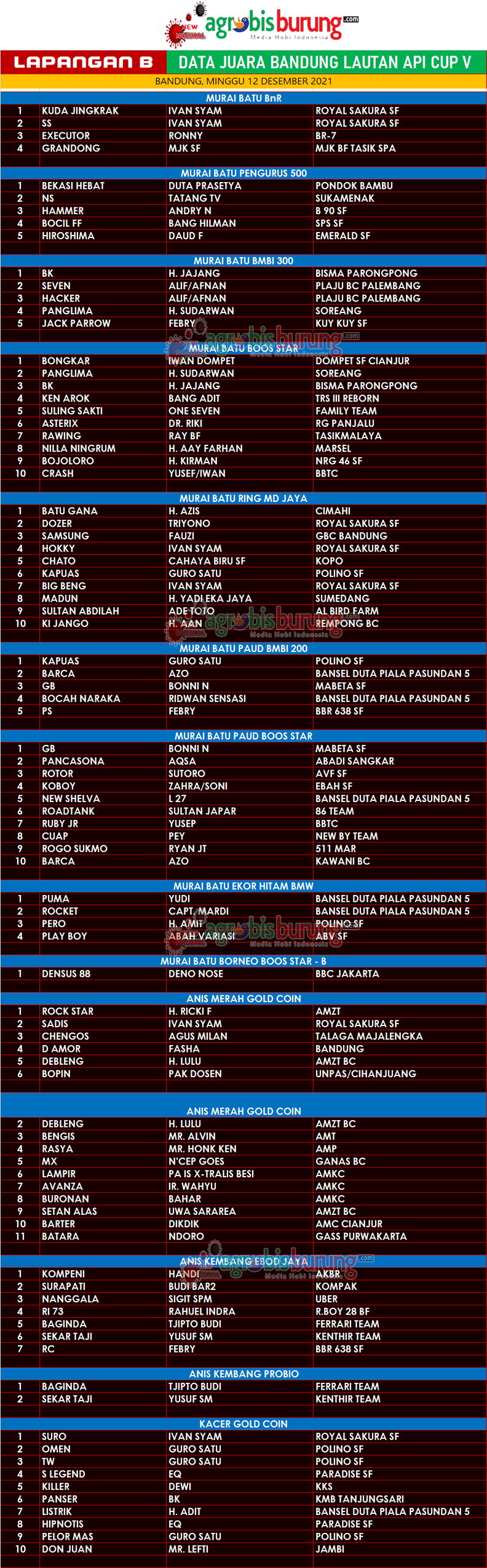 BANDUNG, agrobisburung.com – Data Juara Bandun Lautan Api Cup V 2021 di Bandung, Minggu 12 Desember (LAPANGAN B)