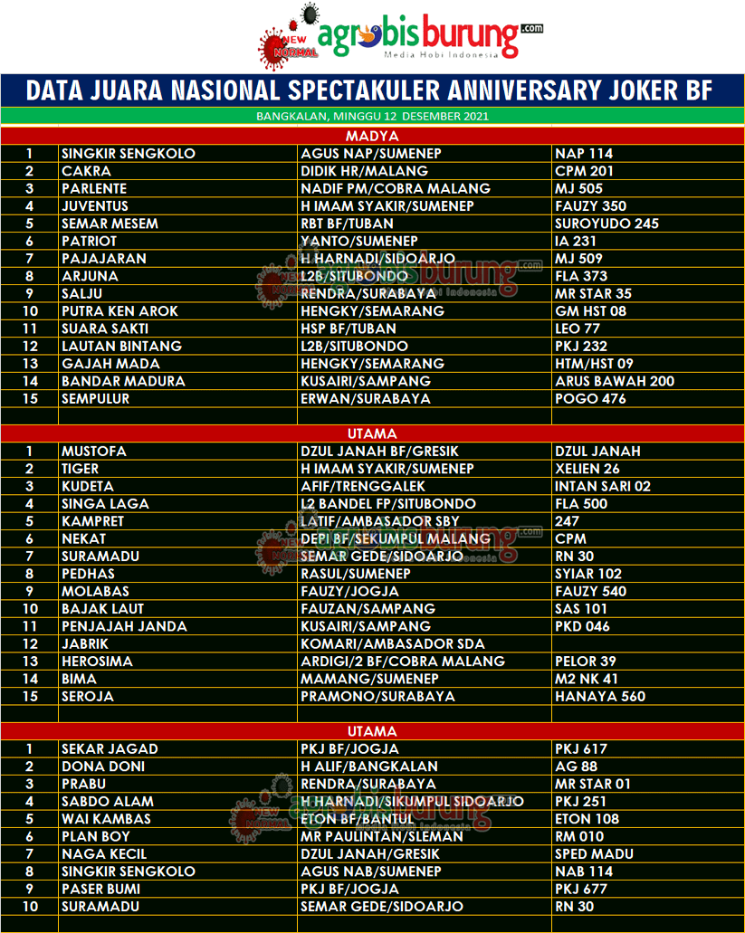 BANGKALAN, agrobisburung.com –  Data Juara Bangkalan Bersatu – Anniversary Joker BF di Bangkalan, Minggu 12 Desember