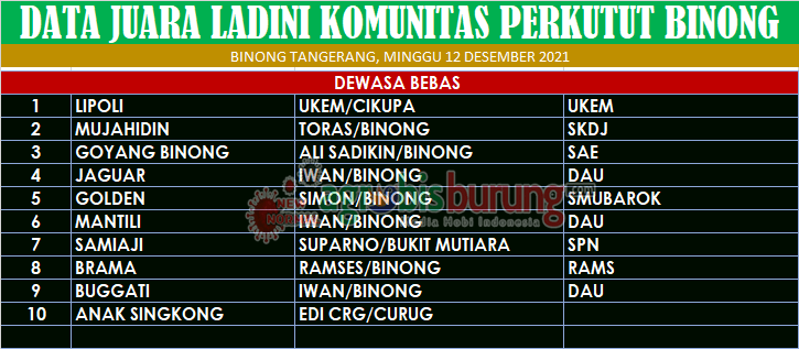 Ladini di Binong memang semakin semarak seiring masa PPKM darurat dicabut. Dan persaingan yang terjadi di kelas kelas dewasa bebas mengantarkan debutan anyar Lipoli bergelang UKEM BF milik Mursidin mampu menunjukkan kehebatannya meraih juara pertama dari Mujahidin milik Toras bergelang SKDS BF yang harus puas di posisi kedua dan posisi ketiga dipegang Goyang Binong milik Mas Ali Sadikin Ring SAE BF.