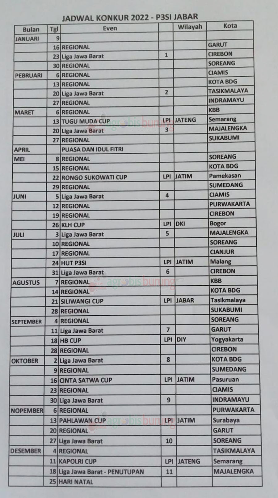 Kemudian dalam pertemuan ini disepakati pula mengenai rencana akan digelarnya kembali Liga Perkutut Jawa Barat (LPJB), yang tidak digelar selama 2 musim, yakni 2020 dan 2021 akibat corona. Untuk menjalankan LPJB 2022 dibentuk kepanitiaan khusus, yang diketuai langsung oleh H. Yadi Tunas, kemudian dibantu wakilnya Ancu Sunardi Platinum Cirebon, sekertaris Bobi Prasasti Cirebon, bendahara H. Nono Ganesha Majalengka, dan humas H. Abdul Latief Trisula Garut. Sedangkan ketua Pengwil Jabar David Dewantara (Ayin) sebagai penanggungjawab sekaligus penasehat, yang dibantu H. Azis HAAS Cirebon.