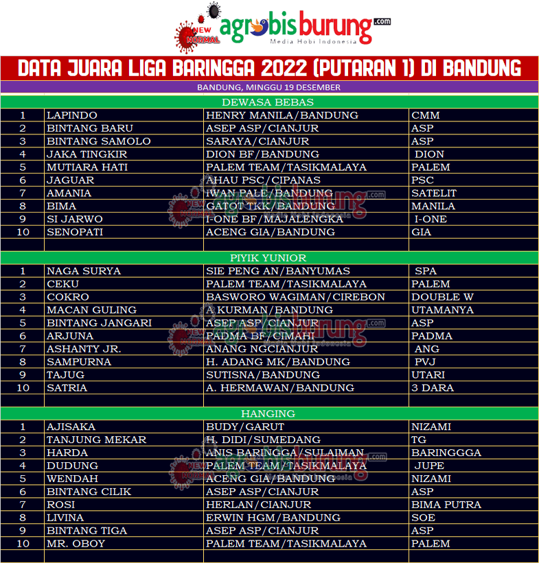 Headline Hobi Burung Juara Organizer Perkutut Perkutut Profil Data Juara Liga Baringga 2022 # 1 di Bandung, Minggu 19 Desember agrobisburung 19 Desember 2021 BANDUNG, agrobisburung.com – Data Juara Liga Baringga 2022 # 1 di Bandung, Minggu 19 Desember Tinggalkan Komentar Post navigation Previous: Data Juara Latber Gotong Royong Pengda Kediri, Minggu 19 DesemberNext: Data Juara Gotong Royong Cup 2021 di Jakarta, Minggu 19 Desember More Stories Headline Perkutut Profil Tambah Amunisi & Trah Ciamik H Iwan TS Jombang Boyong Produk Grand Master Dan LY BF Surabaya agrobisburung 28 November 2025 Headline Juara Perkutut Profil H Pendi Nadira Jakarta Terus Kembangan Trah Jawara Import-Lokal Pilihan Terbaik, Jebol K-WAT BTC-Hongkong-Tesla dari WAT BF Tasikmalaya dengan Transaksi Istimewa agrobisburung 28 November 2025 Headline Perkutut Profil Daftar Bookingan K-WAT Slipknot Terus Bertambah, H. Sunan RJL Cilacap & Kok Tong Hollywood Lombok Masuk Antrian 3-4, Hendry WAT Tasikmalaya Batasi Sampai Bookingan Kelima agrobisburung 25 November 2025
