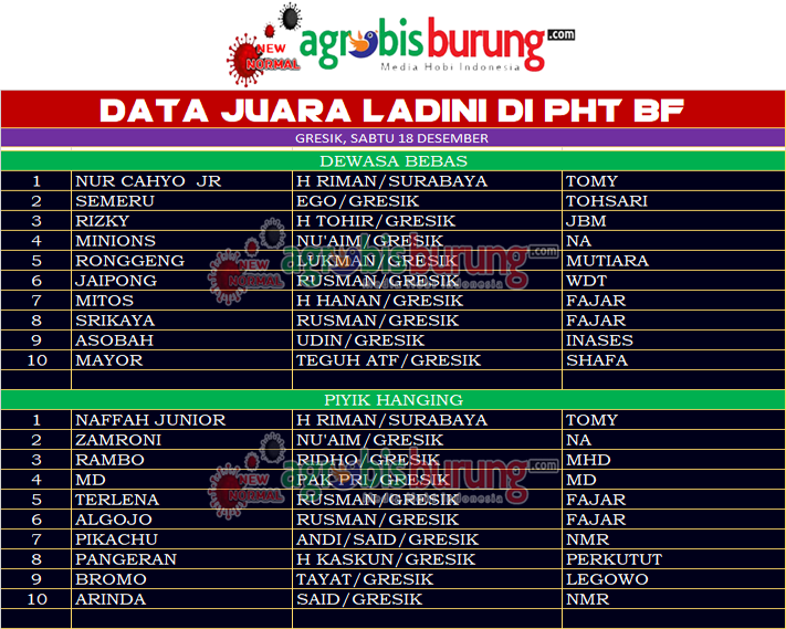 GRESIK, agrobisburung.com –Latber rutin yang dikemas dengan latihan dinilai (ladini) kembali di gelar di markas PHT BF Gresik pada Sabtu (18/12) berjalan meriah. Ladini yang dihadiri kungmania seputaran Gresik dan Surabaya menampilkan jawara jawara handal yang bertarung di masing masing kelas. Di latber kali ini dua jawara hebat milik H Riman Surabaya yang diturunkan melejit di dua kelas yang dimainkan, di dewasa bebas, Nurcahyo Jtr bergelang Tomy mampu melejit diposisi pertama setelah meredam Semeru bergelang Tohsari dan Rizky bergelang JBM yang harus puas di posisi kedua dan ketiga.