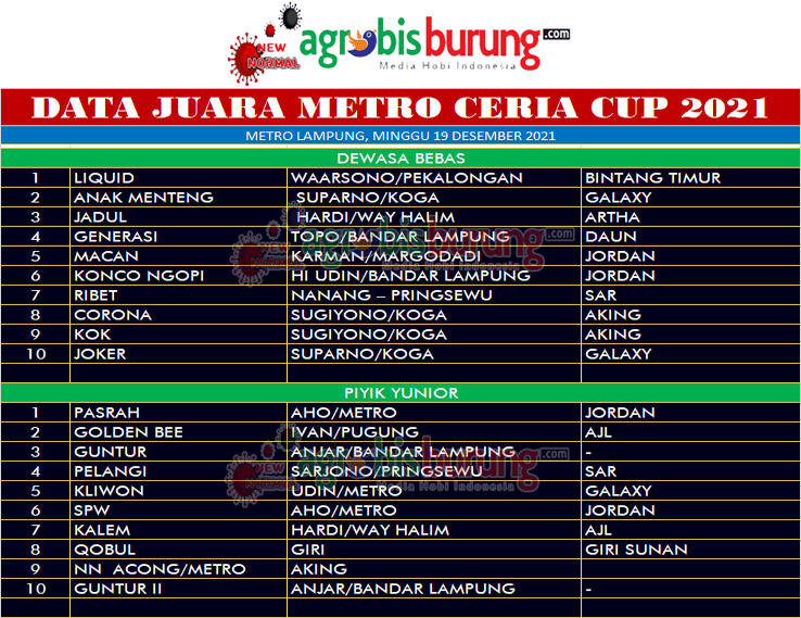 BANDARLAMPUNG, agrobisburung.com – Gelaran latber Metro Ceria Cup 2021 di Lapangan Pengda Metro 16 C di Metro Lampung pada Minggu (19/12) berjalan meriah. Semarak hobi perkutut di Metro Lampung yang semakin seru membuat banyak peserta yang memenuhi agenda lomba dan juga hadirnya jawara jawara handal yang ikut di turunkan membuat persaingan antar kelas menjadi menarik. Di dewasa bebas, Liquid bergelang Bintang Timur menjadi yang terbaik bersama Pasrah bergelang Jordan milik Aho Metro Lampung di kelas piyik yunior.