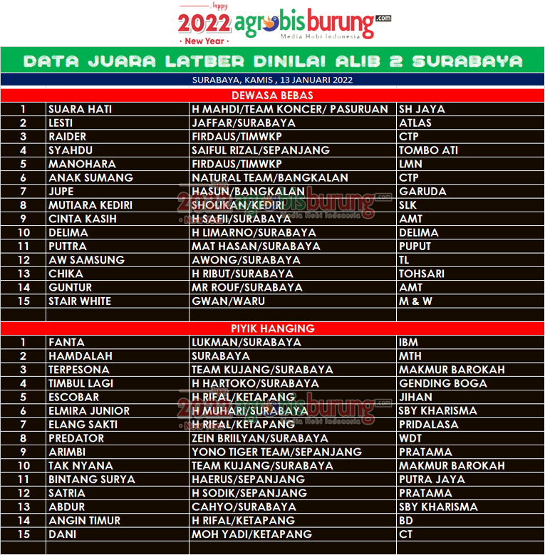 Di kelas piyik hanging, jawara Fanta bergelang IBM milik Lukman bikin kejutan di latber kali ini, tampil dominan selama 4 babak Fanta membuktikan produk IBM mampu menjadi yang terbaik di kelasnya. Namun untuk tampil dominan Fanta juga harus bertarung sengit melawan Hamdalah bergelang MTH dan Terpesona bergelang Makmur Jaya yang diakhir babak harus mengalah di posisi kedua dan ketiga. AB-END