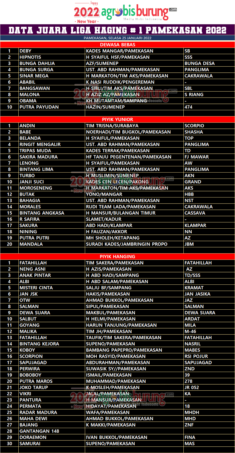 Di kelas tambahan dewasa bebas, Deby bergelang SB milik Kades Mangar kembali menjadi yang terbaik dikelasnya, usai lomba di Pasuruan Deby langsung diturunkan di Liga Hanging Pamekasan dan tetap prima untuk meraih posisi pertama. Disusul Hipnotis bergelang SSS di urutan kedua dan Bunga Dahlia bergelang Bunga Desa diurutan ketiga.