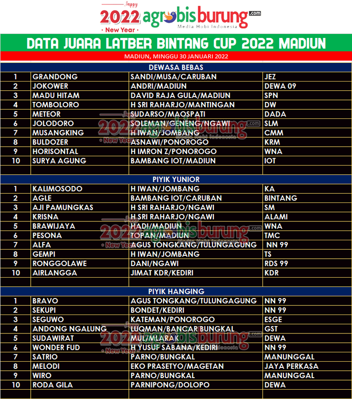 Dikelas piyik yunior, debutan anyar H Iwan TS Jombang bernama Kalimosodo bergelang KA menjadi yang terbaik di kelasnya, tampil dominan sepanjang babak Kalimosodo membuat Angle bergelang Bintang dan Aji Pamungkas bergelang SM harus puas di posisi kedua dan ketiga. Dan dikelas piyik hanging, jawara Bravo milik Agus Tongkang bergelang NN 99 dan Sekupi milik Bondet Kediri yang juga begelang NN 99 berbagi posisi pertama dan kedua. Dan di posisi ketiga diraih Segowu bergelang Esge. AB-END