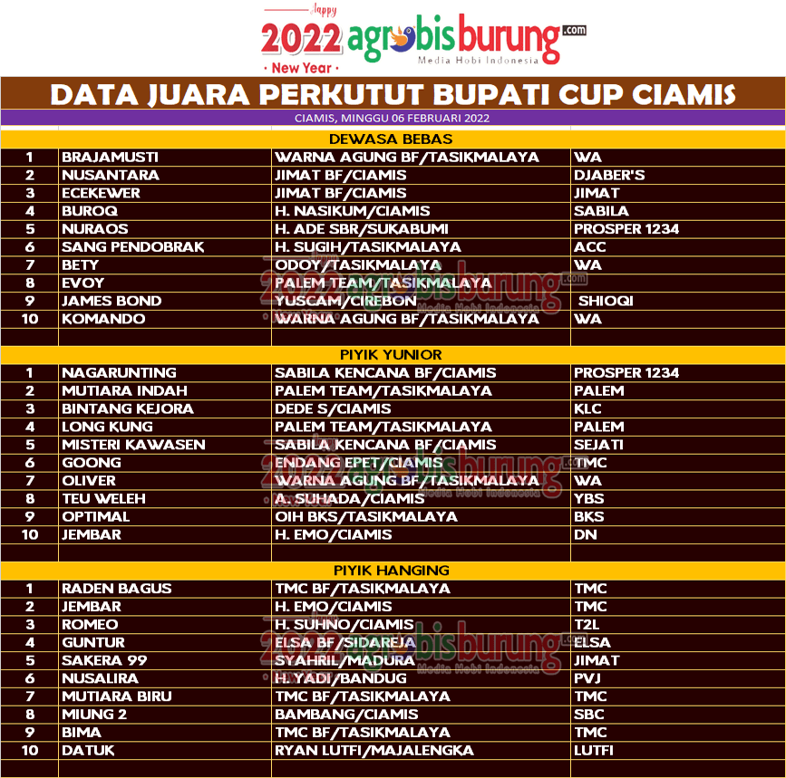 CIAMIS, agrobisburung.com – Data Juara Bupati Cup Ciamis, Minggu 06 Februari
