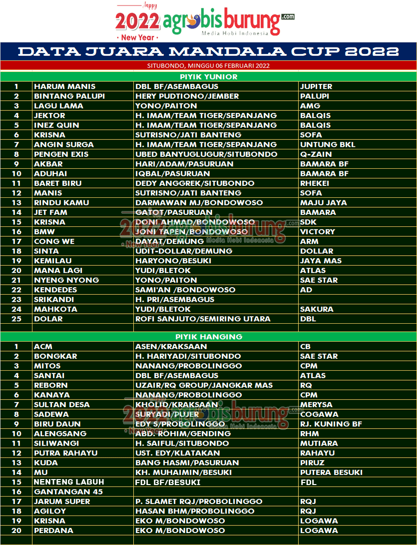 Headline Hobi Burung Juara Organizer Perkutut Perkutut Profil Tokoh Data Juara Mandala Cup 2022 di Situbondo, Minggu 06 Februari agrobisburung 6 Februari 2022 SITUBONDO, agrbisburung.com – Data Juara Mandala Cup 2022 di Situbondo, Minggu 06 Februari Tinggalkan Komentar Post navigation Previous: Data Juara Latber Gotong Royong Pengda Nganjuk, Minggu 06 FebruariNext: Data Juara Endrata Cup di Kebumen 2022, Minggu 06 Februari More Stories Headline Perkutut Profil Nunu Depok “Turun Gunung” Langsung Borong 5 Pasang K-Unggulan WAT BF Tasikmalaya, H. Pendi Nadira Jakarta Jebol K-WAT Brahmana & BDB BF Lombok Jebol K-WAT Raja Ampat agrobisburung 13 Januari 2026 Headline Juara Perkutut Jawara Bandar Jawa 1, Boxer & Joko Tarub Melejit ke Podium Utama Di Latihan Dinilai Pengcam Pengantenan Pamekasan agrobisburung 12 Januari 2026 Headline Juara Perkutut Jawara Gading Asmara & Cah Samin Berkuasa Dikelasnya di Latihan Dinila Pengda Bojonegoro agrobisburung 11 Januari 2026