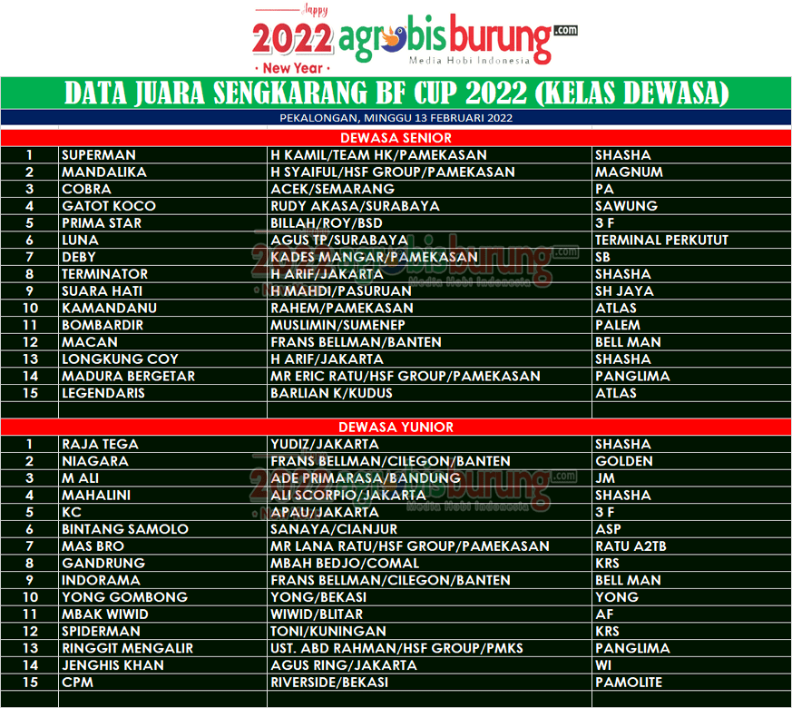 PEKALONGAN, agrobisburung.com – Data Juara Sengkarang Cup 2022 di Pekalongan, Minggu 13 Februari (Kelas Dewasa)