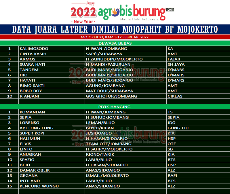 MOJOKERTO, agrobisburung.com – Latber di nilai di markas Mojopahit BF Mojokerto pada Kamis (17/02) menjadi ajang yang menarik buat kung Mojokerto dan sekitarnya dan juga menjadi pembuktian jago jago terbaik amunisi Team TS Jombang. Team TS Jombang yang mengusung beberapa jawara handal langsung menguasai dua podium kejuaraan di kelas dewasa bebas dan piyik hanging.
