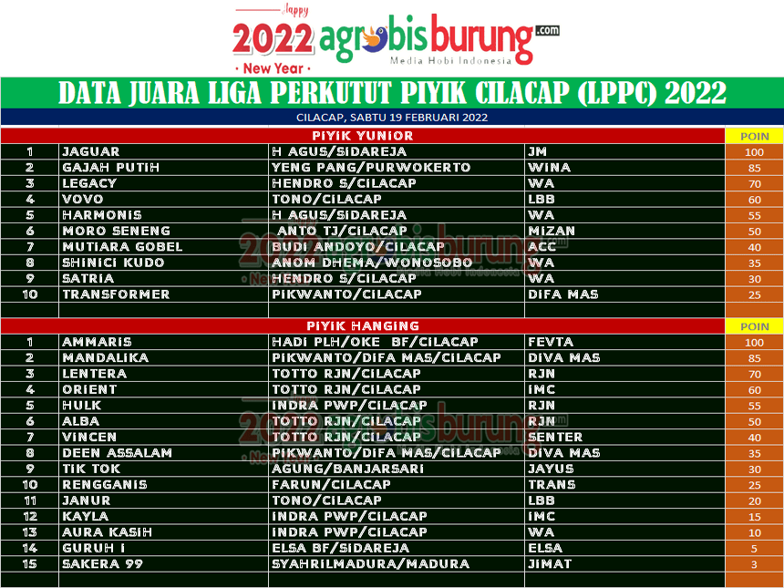 CILACAP, agrobisburung.com – Gelaran seri lanjutan Liga Perkutut Piyik Cilacap (LPPC) 2022 # 2 di Cilacap kembali dilajutkan pada Sabtu ( 19/02) di markas PLH BF Cilacap berjalan menarik. Kungmania yang sudah mendulang poin di putaran pertama tak mau ketinggalan berburu poin di putaran # 2 dan ini juga membuat jalannya lomba sangat seru, di piyik yunior, debutan muda Jaguar bergelang JM milik H Agus Sidareja bikin kejutan di putaran kedua dan mampu merebut podium pertama setelah mampu menggeser lawan lawannya. Gajah Putih bergelang Wina dan Legacy bergelang WA yang tak bisa leluasa mengejar poin Jaguar  harus puas di podium kedua dan ketiga.