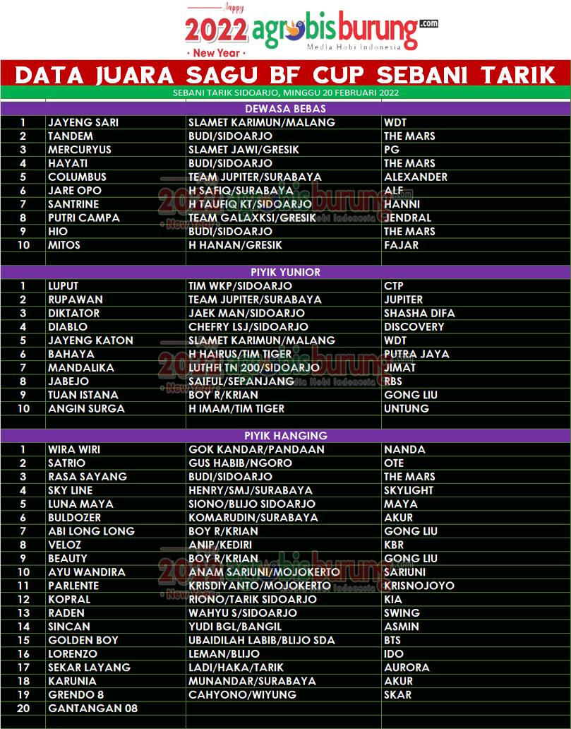 SIDOARJO, agrobisburung.com – Gelaran latber Sebani Tarik Sidoarjo berlabel Sagu BF Cup 2022 pada Minggu (20/02) menjadi ajang pembuktian jawara jawara di seputran Sidoarjo dan sekitarnya. Jago jago yang turun berlomba merupakan debutan debutan yang memang dipersiapkan untuk gelaran gelaran bergengsi tersebut mampu tampil perkasa. Di Dewasa Bebas, Jayeng Sari bergelang WDT milik Slamet Karimun selalu tampil perkasa, produk WDT tersebut memang memiliki peforma yang stabil sehingga selalu meraih podium di setiap penampilannya dan juga ini menjadi pembuktian produk WDT sebagai produk hebat dan berkualitas. Kali ini Jayeng Sari masih bertahta di posisi pertama disusul Tanden bergelang The Mars di posisi kedua dan Mercuryus bergelang PG di posisi ketiga.