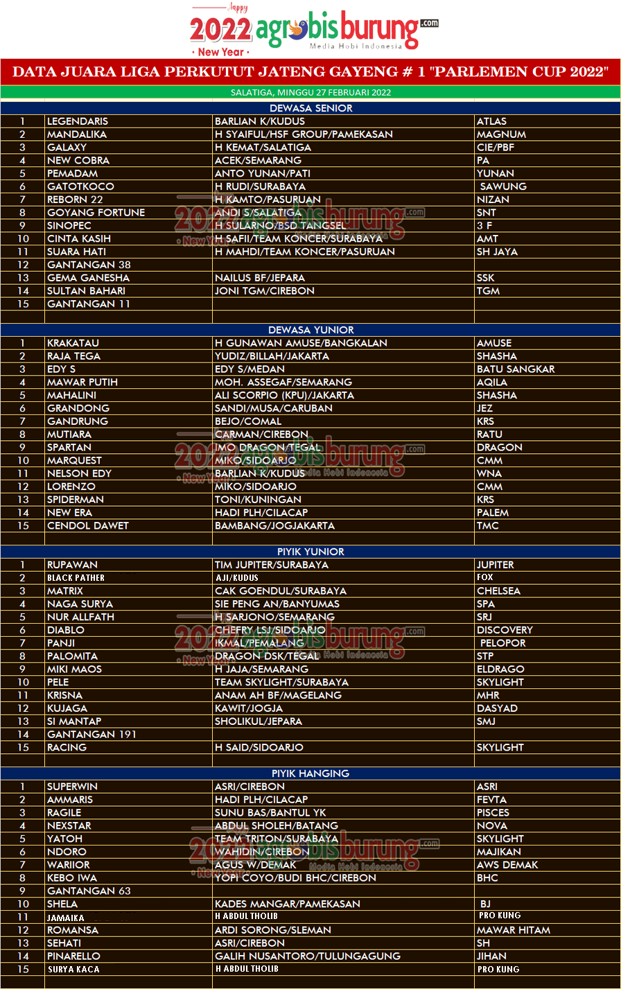 Data Juara Liga Perkutut Jateng Gayeng # 1 “Parlemen Cup 2022” di Semarang, Minggu 27 Februari