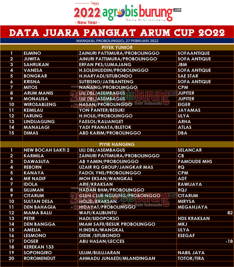 Headline Hobi Burung Juara Organizer Perkutut Perkutut Profil Data Juara Pangkat Arum Cup 2022 Di Wangkal Probolinggo, Minggu 27 Februari agrobisburung 27 Februari 2022 Data Juara Pangkat Arum Cup 2022 Di Wangkal Probolinggo, Minggu 27 Februari Tinggalkan Komentar PROBOLINGGO, agrobisburung.com – Data Juara Pangkat Arum Cup 2022 Di Wangkal Probolinggo, Minggu 27 Februari Tinggalkan Komentar Post navigation Previous: Data Juara Latber Perkutut di Sukabumi, Minggu 27 FebruariNext: Data Juara Liga Gotong Royong di Tulungagung, Minggu 27 Februari More Stories Headline Perkutut Profil Nunu Depok “Turun Gunung” Langsung Borong 5 Pasang K-Unggulan WAT BF Tasikmalaya, H. Pendi Nadira Jakarta Jebol K-WAT Brahmana & BDB BF Lombok Jebol K-WAT Raja Ampat agrobisburung 13 Januari 2026 Headline Juara Perkutut Jawara Bandar Jawa 1, Boxer & Joko Tarub Melejit ke Podium Utama Di Latihan Dinilai Pengcam Pengantenan Pamekasan agrobisburung 12 Januari 2026 Headline Juara Perkutut Jawara Gading Asmara & Cah Samin Berkuasa Dikelasnya di Latihan Dinila Pengda Bojonegoro agrobisburung 11 Januari 2026