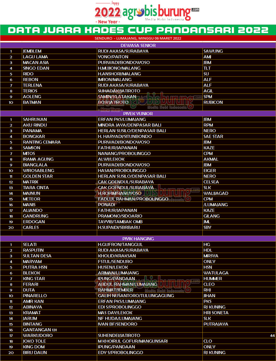 LUMAJANG, agrobisbruurng.com – Data Juara Kades Cup Pandasari 2022 Di Senduro Lumajang, Minggu 06 Maret