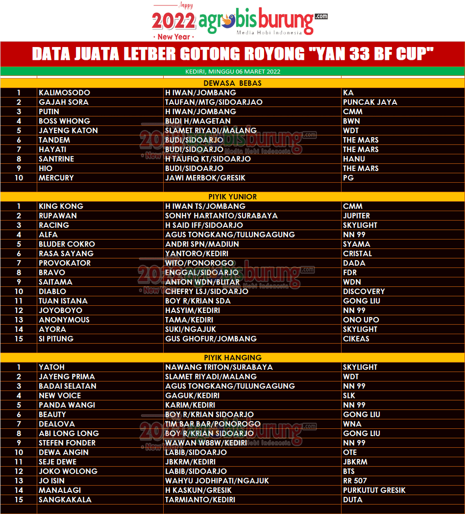 KEDIRI, agrobisburung.com – Data Juara Latber Gotong Royong “Yan 33 BF Cup” Di Kediri, Minggu 06 Maret