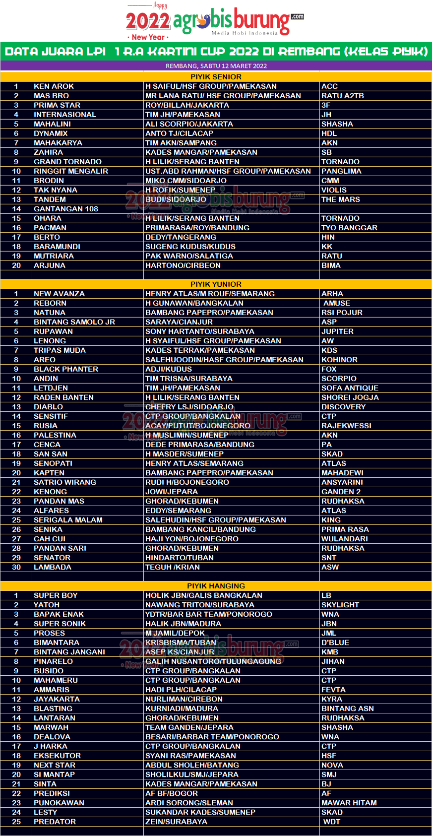 Data Juara LPI # 1 R.A Kartini Cup 2022 di Rembang Jateng, Sabtu 12 Maret (Kelas Piyik)