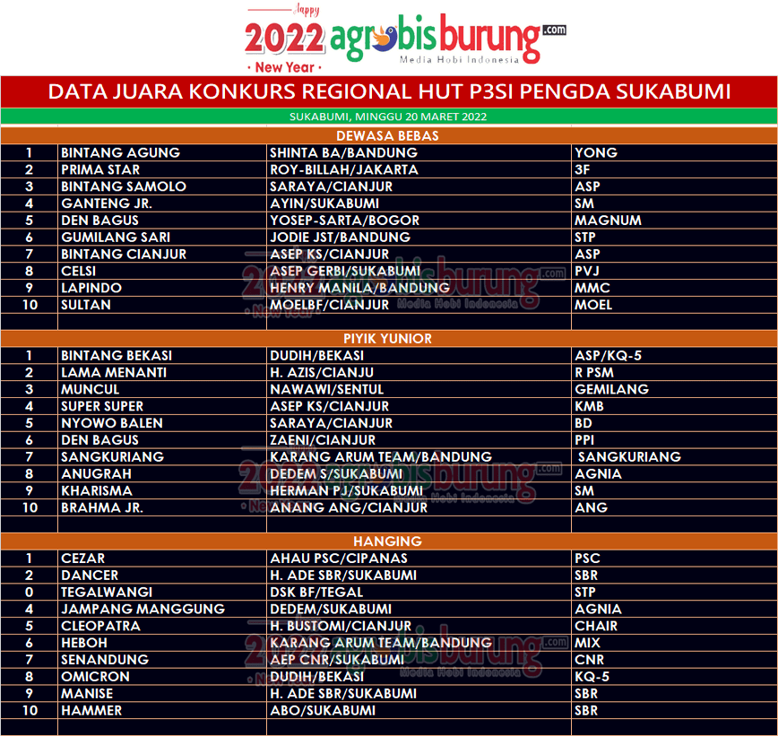 Headline Hobi Burung Juara Organizer Perkutut Perkutut Profil Tokoh Data Juara Konkurs HUT P3SI Pengda Sukabumi 2022, Minggu 20 Maret agrobisburung 22 Maret 2022 Data Juara Konkurs HUT P3SI Pengda Sukabumi 2022, Minggu 20 Maret Tinggalkan Komentar SUKABUMI. agrobisburung.com – Data Juara Konkurs HUT P3SI Pengda Sukabumi 2022, Minggu 20 Maret Tinggalkan Komentar Post navigation Previous: Andri BF Bekasi Berburu Burung Potensial ke Berbagai Blok, Produk Semar Terbukti KualitasnyaNext: Pemanasan Jelang LPJB-Baringga Bandung, Bintang Agung Bersinar, Bintang Bekasi Tangguh, Cezar Ngorbit di HUT P3SI Pengda Sukabumi More Stories Headline Perkutut Profil Nurul Dewi Anggun BF Tamberu Sampang Terus berburu Jagoan Lomba & Kembali Taker Over Jawara LPI Diamond (AKS) Dari Masday Dengan Harga Super Fantastik agrobisburung 17 Februari 2026 Headline Perkutut Profil Hendry Kembali Rombak 25% Formasi Kandang WAT BF Tasikmalaya, Pramando BSD Booking Semua Kandang dengan Nilai Transaksi Spektakuler agrobisburung 17 Februari 2026 Headline Perkutut Profil Jawara Muda Arya Penangsang Orbitan Anyar H. Hairul 3 Bintang Team Moncer di Pamekasan, Generasi Terkini Platinum BF Cirebon agrobisburung 17 Februari 2026