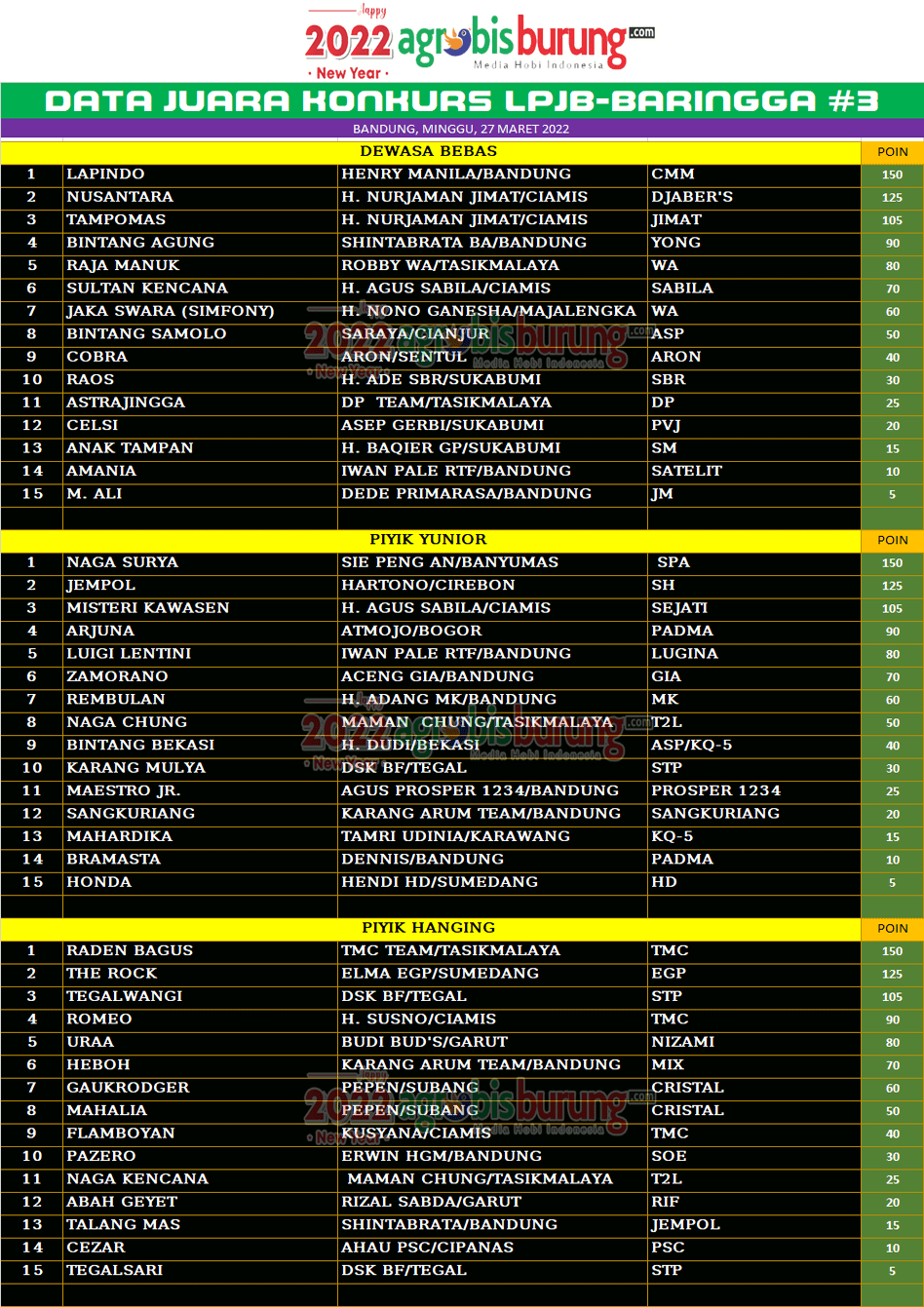 Headline Hobi Burung Juara Organizer Perkutut Perkutut Profil Data Juara Konkurs LPJB Baringga # 3 2022 di Bandung, Minggu 27 Maret agrobisburung 28 Maret 2022 Data Juara Konkurs LPJB Baringga # 3 2022 di Bandung, Minggu 27 Maret Tinggalkan Komentar BANDUNG, agrobisburung.com – Data Juara Konkurs LPJB Baringga # 3 2022 di Bandung, Minggu 27 Maret Tinggalkan Komentar Post navigation Previous: Data Juara LP. Jateng Gayeng 2022 # 2 di Pemalang, Minggu 27 MaretNext: Tembus Tiga Besar, MB Matahari Sakti Stabil Di Jalur Prestasi Di Indonesia Muray Champion BnR Feat Masterpiece Arena Tangerang More Stories Headline Perkutut Profil Nurul Dewi Anggun BF Tamberu Sampang Terus berburu Jagoan Lomba & Kembali Taker Over Jawara LPI Diamond (AKS) Dari Masday Dengan Harga Super Fantastik agrobisburung 17 Februari 2026 Headline Perkutut Profil Hendry Kembali Rombak 25% Formasi Kandang WAT BF Tasikmalaya, Pramando BSD Booking Semua Kandang dengan Nilai Transaksi Spektakuler agrobisburung 17 Februari 2026 Headline Perkutut Profil Jawara Muda Arya Penangsang Orbitan Anyar H. Hairul 3 Bintang Team Moncer di Pamekasan, Generasi Terkini Platinum BF Cirebon agrobisburung 17 Februari 2026