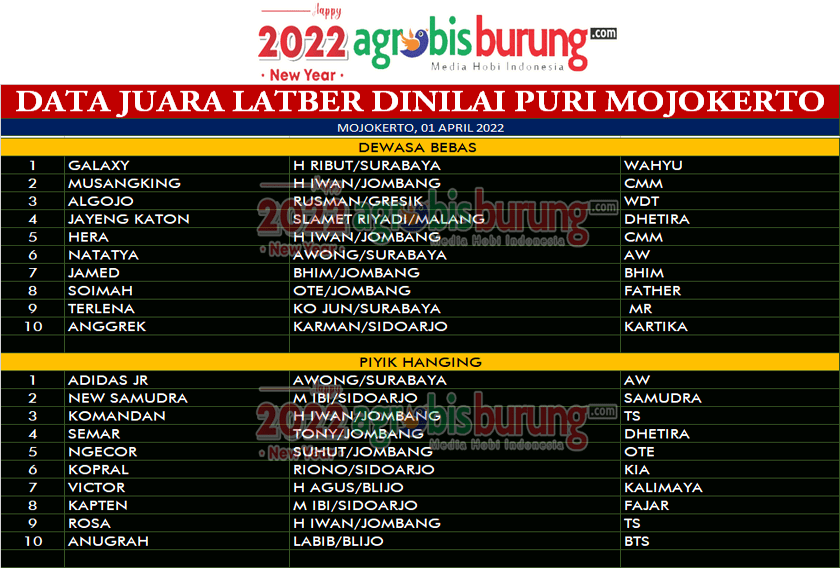 Di Dewasa bebas, Galaxy bergelang Wahyu yang dikawal H Ribut Surabaya pamer aksi kemenangan setelah sukses mengalahkan Musangking bergelang CMM dan Algojo bergelang WDT. Setelah sepanjang babak tak bisa meladeni aksi Galaxy yang melejit di podium pertama, Musangking dan Algojo terdepak di urutan kedua dan ketiga. Sementara di kelas piyik hanging pamer aksi jawara muda Adidas Jr bergelang AW milik Awong Surabaya sukses meraih podium pertamanya dipuncak kejuaraan. AB-END