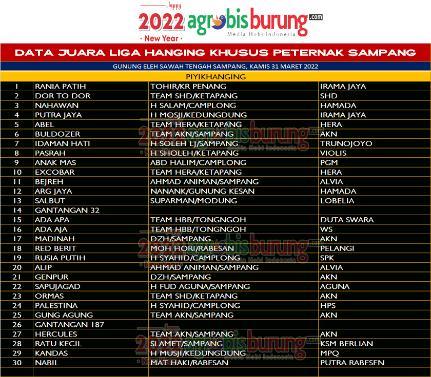 SAMPANG, agrobisburung.com – Lanjutan seri 2 Liga Hanging Khusus Peternak Sampang 2022 di Robetal pada Kamis (31/03) menjadi pembuktian produk produk lokal untuk tanmpil terbaik. Di seri 2 ini Rania Patih bergelang Irama Jaya moncer ke podium pertama setelah lepas dari kepungan Dor To Dor bergelang SHD dan Nahawan begelang Hamada.