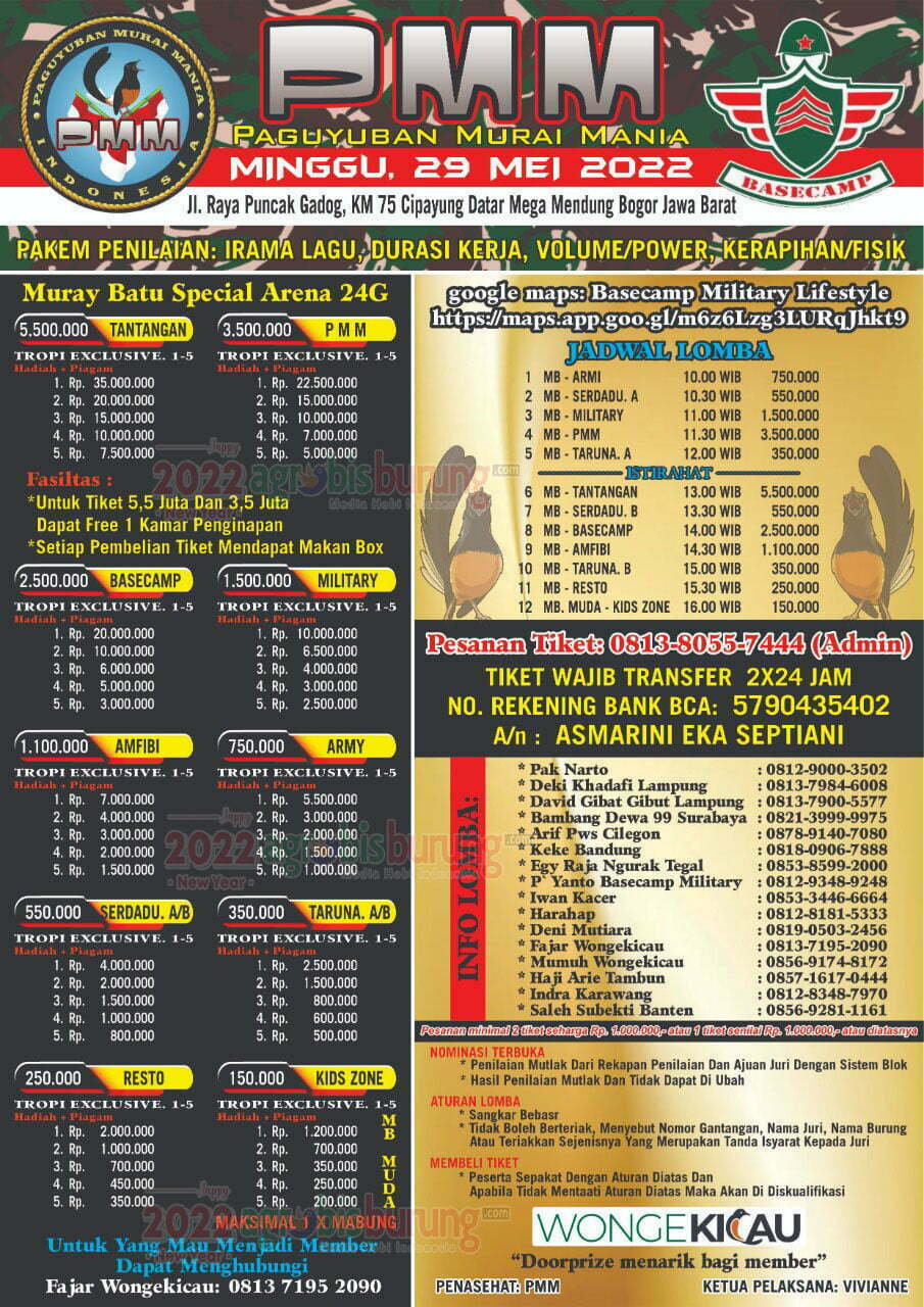BOGOR, agrobisburung.com – Gelaran Soft Lonching Paguyuban Murai Mania atau PMM dilapangan Yotama New Lenggang (27/3), mendapat respon positif dari kalangan penggemar murai batu. Lomba pun berjalan lancar dan sukses tanpa teriak. Umumnya mereka yang gantang merasa puas bermain di gelaran perdanya PMM ini dengan system penilaiannya. Dan Setelah Lebaran nanti, PMM bakal menggelar lomba akbar dengan hadiah yang cukup menggiurkan bertempat di Jl. Raya Puncak Gadog, KM 75 Cipayung Datar Mega Mendung Bogor, Jawa Barat, Minggu 29 Mei 2022.