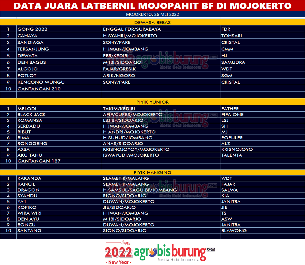 Di piyik yunior, debutan muda Melodi milik Takim Kediri menjadi penguasa baru di kelasnya, disusul di kelas piyik hanging jawara muda Kakanda bergelang WDT milik Slamet Riadi menjadi yang terbaik di piyik hanging.