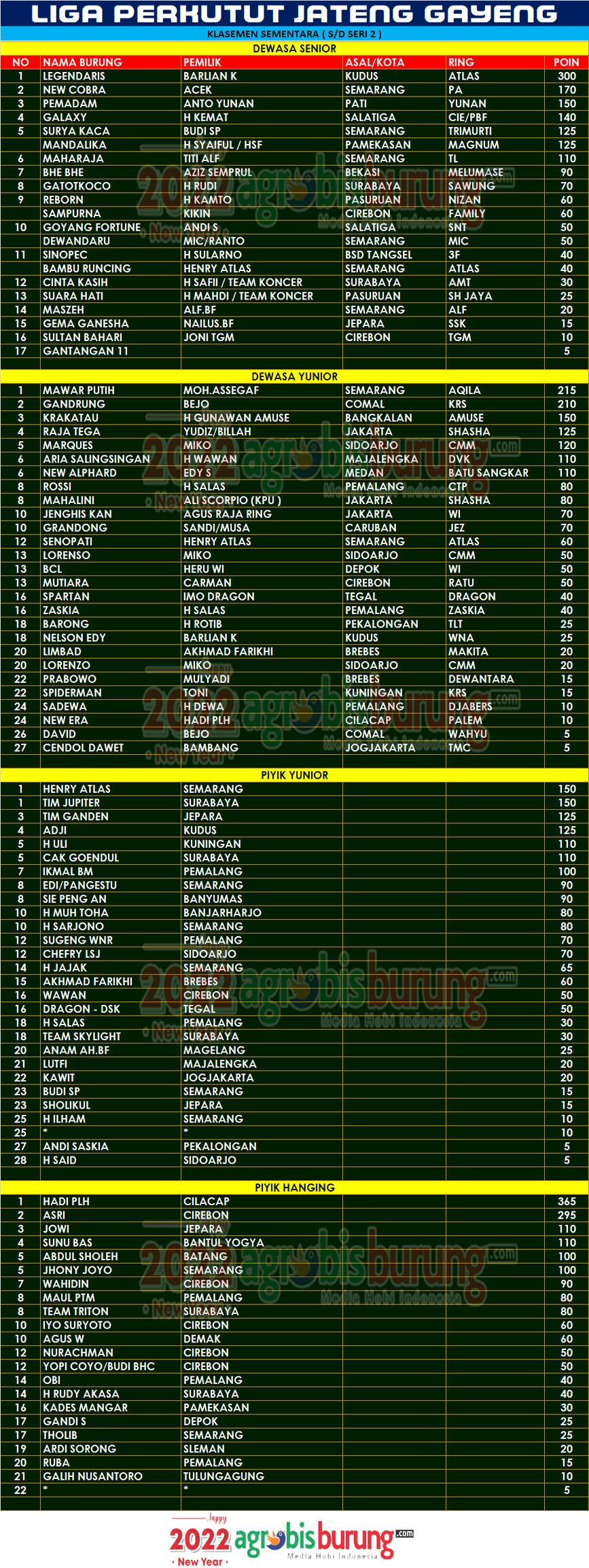 SEMARANG, agrobisburung.com – Rilis Klasemen Sementara LP. Jateng Gayeng 2022 jelang Parlemen Cup Salatiga, Legendaris & Mawar Putih Berkuasa