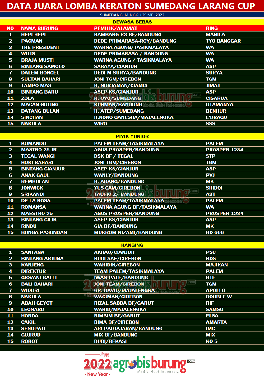 SUMEDANG, agrobisburung.com –  Data Juara Lomba Keraton Sumedang Larang Cup, Minggu 29 Mei
