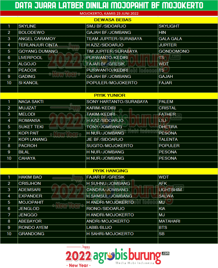 Sementara di kelas piyik yunior dan hanging juaranya juga merupakan jawara muda yang ciamik, Naga Sakti bergelang Palem milik Sony Hartanto menjadi yang terbaik pertama di piyik yunior. Dan Hakim Bao begelang WDT milik Fajar BF Gresik menjadi yang terbaik pertama di hanging. AB-END