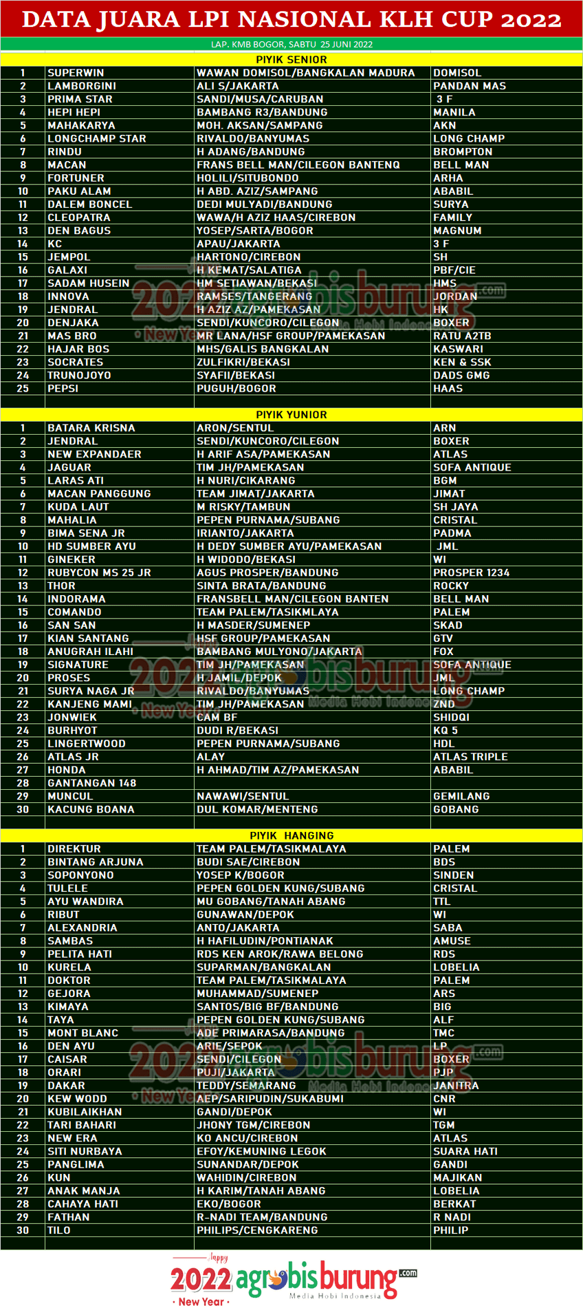 Headline Hobi Burung Juara Organizer Perkutut Perkutut Profil Data Juara LPI Nasional KLH Cup 2022 di Bogor, Sabtu 25 Juni (KELAS PIYIK) agrobisburung 25 Juni 2022 Data Juara LPI Nasional KLH Cup 2022 di Bogor, Sabtu 25 Juni (KELAS PIYIK) Tinggalkan Komentar BOGOR, agrobisburung.com – Data Juara LPI Nasional KLH Cup 2022 di Bogor, Sabtu 25 Juni (KELAS PIYIK) Tinggalkan Komentar Post navigation Previous: Seru, Skyline, Naga Sakti & Hakim Bao Melejit di Latber Dinilai Mojopahit MojokertoNext: Data Juara LPI Nasional KLH Cup 2022 di Bogor, Minggu 26 Juni (KELAS DEWASA) More Stories Headline Perkutut Profil WAT BF Tasikmalaya Rilis 69 Kandang Terbaru, “Final Update Season Imlek-Awal Puasa 2026” & Gelar Promo Spesial Selama Sepekan agrobisburung 18 Februari 2026 Headline Perkutut Profil Nurul Dewi Anggun BF Tamberu Sampang Terus berburu Jagoan Lomba & Kembali Taker Over Jawara LPI Diamond (AKS) Dari Masday Dengan Harga Super Fantastik agrobisburung 17 Februari 2026 Headline Perkutut Profil Hendry Kembali Rombak 25% Formasi Kandang WAT BF Tasikmalaya, Pramando BSD Booking Semua Kandang dengan Nilai Transaksi Spektakuler agrobisburung 17 Februari 2026