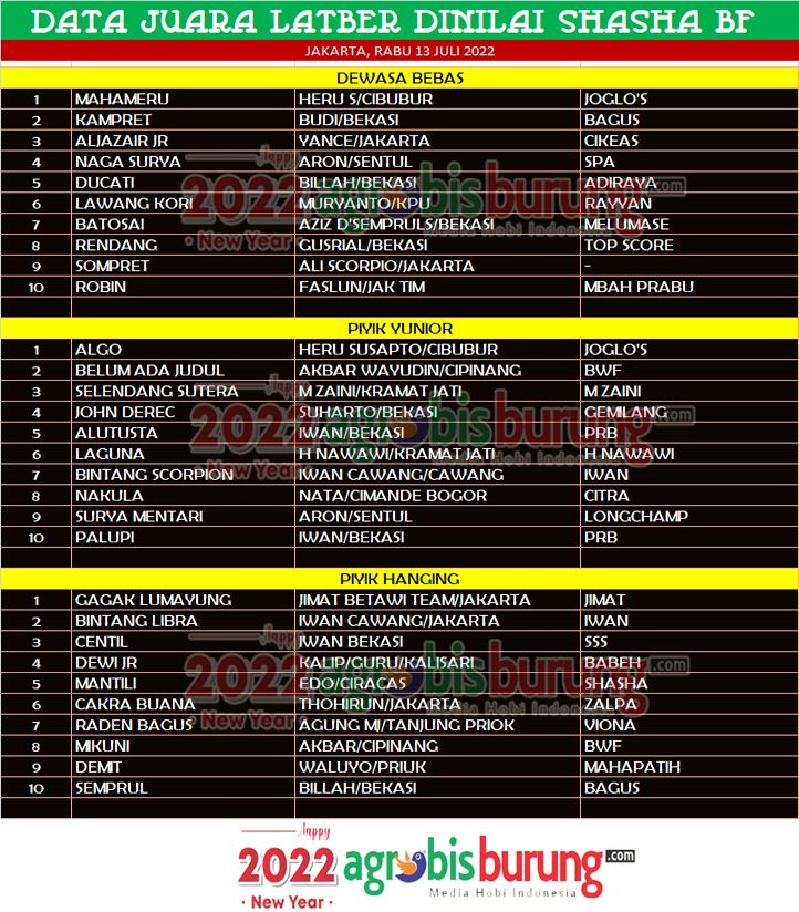 Sementara di kelas piyik hanging, Gagak Lumayung bergelang Jimat milik Jimat Betawi team menjadi yang terbaik pertama. Diakhir lomba H Arif Shasha sebagia tuan rumah mengucapkan terima kasih atas kehadiran kungmania dan dukungannya di latber dinilai Rabuan diu markasnya dan selamat kepada para pemenang di latber dinilai Rabuan Shasha bf. AB-END