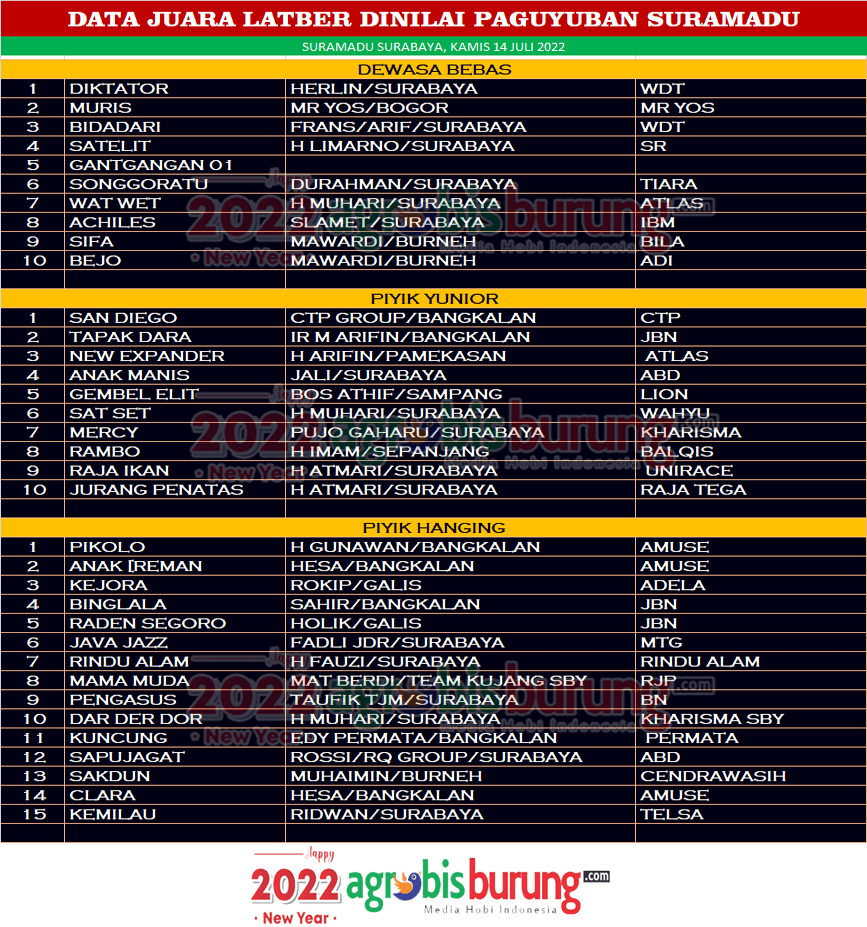 Dan di kelas piyik hanging duet produk Amuse Bangkalan Pikolo milik H Gunawab & Anak Preman milik Hesa bersanding merebut posisi pertama dan kedua, sementara di posisi ketiga di raih Kejora bergelang Adela. AB-END