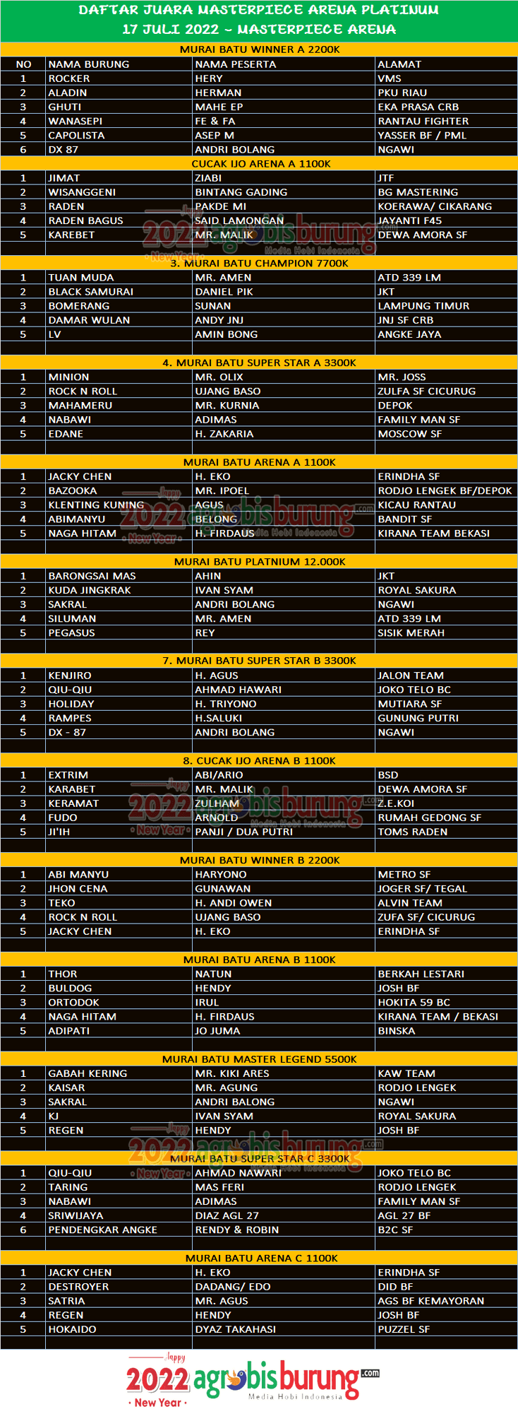 Headline Hobi Burung Juara Kicauan Kicauan Organizer Profil Tokoh Data Juara Master Piece Arena Platinum di Tangerang, Minggu 17 Juli agrobisburung 19 Juli 2022 Data Juara Master Piece Arena Platinum di Tangerang, Minggu 17 Juli Tinggalkan Komentar TANGERANG, agrobisburung.com – Data Juara Master Piece Arena Platinum di Tangerang, Minggu 17 Juli Tinggalkan Komentar Post navigation Previous: MB Destroyer Unjuk Prestasi Di Masterpiece Arena Platinum Samsat BSD TangselNext: MB Guti, Edane, Black Samurai Dan Qiu-Qiu Moncer Di Masterpiece Arena Platinum Samsat BSD Tangsel More Stories Headline Perkutut Profil Tambah Amunisi & Trah Ciamik H Iwan TS Jombang Boyong Produk Grand Master Dan LY BF Surabaya agrobisburung 28 November 2025 Headline Juara Perkutut Profil H Pendi Nadira Jakarta Terus Kembangan Trah Jawara Import-Lokal Pilihan Terbaik, Jebol K-WAT BTC-Hongkong-Tesla dari WAT BF Tasikmalaya dengan Transaksi Istimewa agrobisburung 28 November 2025 Headline Perkutut Profil Daftar Bookingan K-WAT Slipknot Terus Bertambah, H. Sunan RJL Cilacap & Kok Tong Hollywood Lombok Masuk Antrian 3-4, Hendry WAT Tasikmalaya Batasi Sampai Bookingan Kelima agrobisburung 25 November 2025