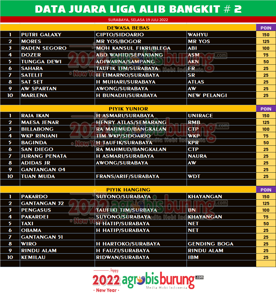 Di kelas piyik yunior, Raja Ikan bergelang Unirace milik H Asmari Surabaya menjadi yang terbaik di kelasnya serta Pakardo bergelang Khayangan menjadi yang terbaik pertama di Hanging. Tampilnya Pakardo di komunitas kungmania Surabaya memang baru muncul namun langsung bikin gebrakan menjadi juara 1 dan jawara milik Suyono Pakard Bf Surabaya juga bakal dibawa ke LPI Malang karena peformanya menawan. AB-END