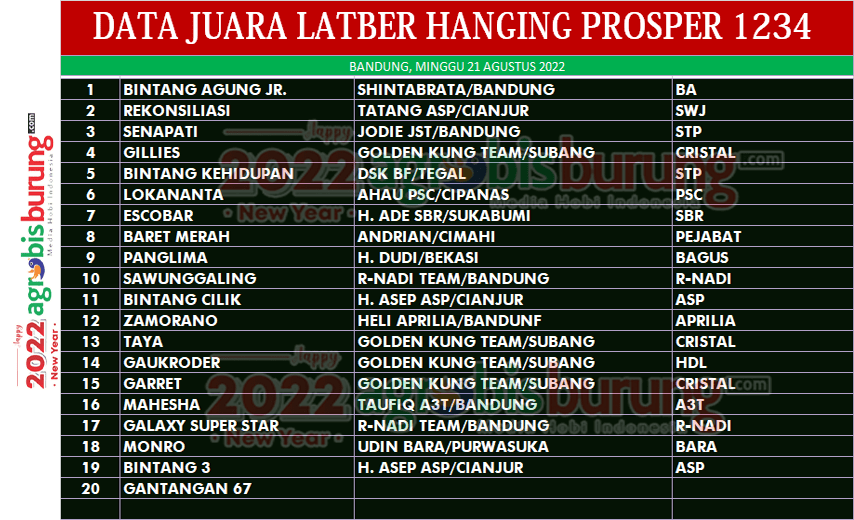 BANDUNG, Agrobisburung.Com –Latber khusus hanging di Lapang Prosper 1234 Kota Baru Parahyangan Bandung, Minggu (21/8/22), berlangsung meriah. Sebanyak 100 gantangan yang disediakan panitia hampir terisi full. Peserta yang hadir tidak hanya dari Bandung Raya, tetapi juga hadir dari Cianjur, Sukabumi, Purwakarta dan Subang. “Alhamdulillah gelaran berlangsung sukses. Ini merupakan ujicoba, dan ternyata responnya bagus. Kita akan adakan secara rutin, bahkan ada masukan untuk digelar dalam bentuk liga KBB-Prosper 1234,” ungkap H. Asep HSP, ketua Pengda KBB.