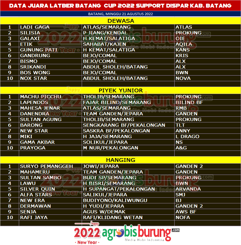 BATANG agrobisburung.com –  Data Juara Latber Batang Cup 2022 Di-support Dinas Pariwisata Kab. Batang, Minggu 21 Agustus