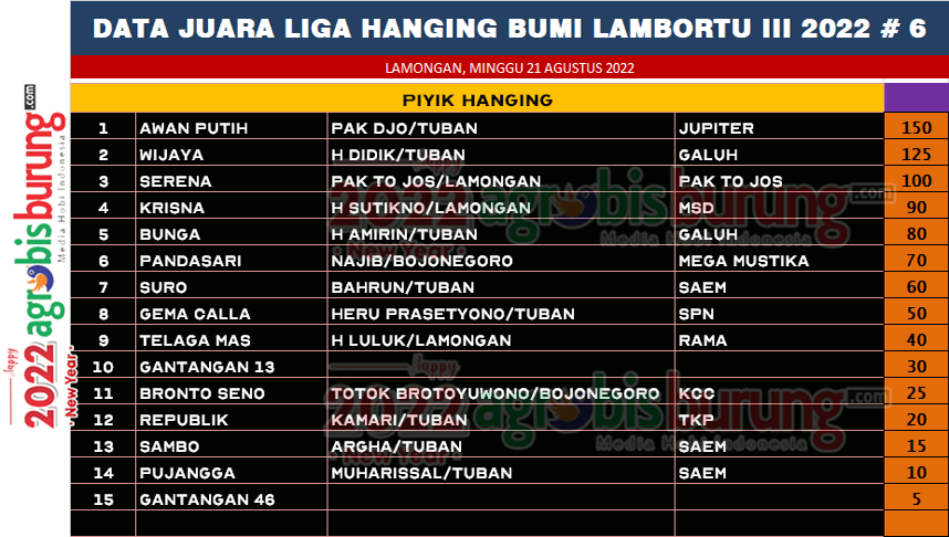 Di akhir lomba H Sutikno, ketua panitia menyampaikan terima kasih atas kehadiran kungmania di seri Liga Hanging Lambortu di Lamongan, selamat kepada para juara yang akan menjadi duta terbaik memajukan hobi perkutut di Pantura Lambortu. AB-IKI/end