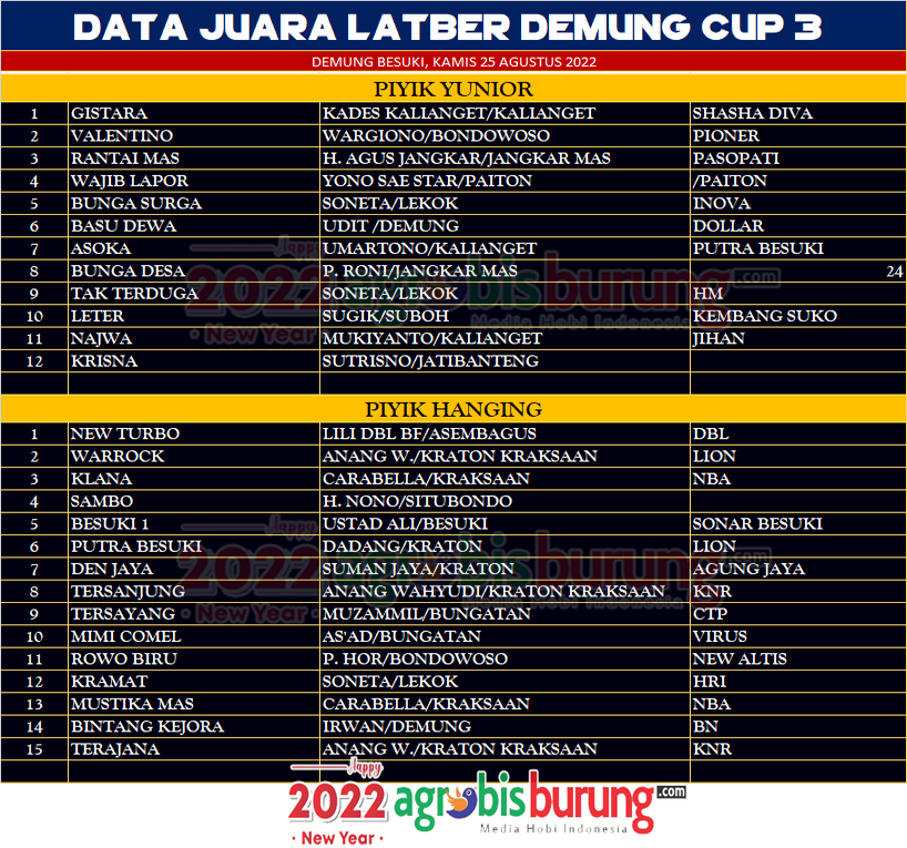 Dan di kelas piyik hanging, debutan mudaNew  Turbo milik Lili DBL Asembagus mampu menunjukkan kehebatannya membabat lawan lawannya dan juga bagi Lili kemenangan produknya menjadi pembuktian produk DBL bisa eksis di posisi pertama. Dan di posisi kedua dan ketiga diraih jawara Warrock dan Kelana. AB-INU/end