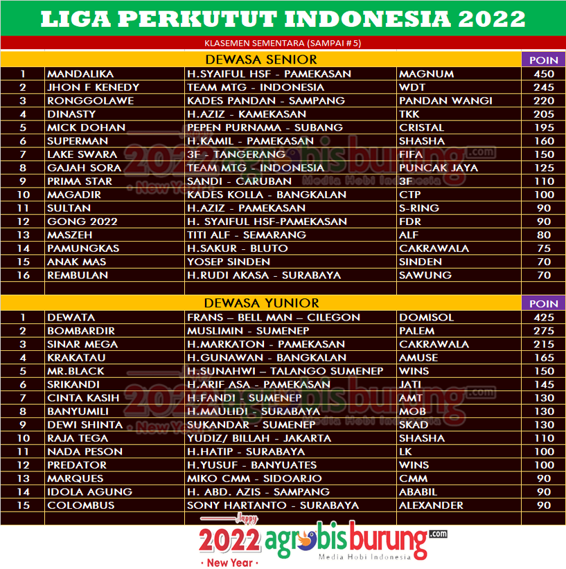 CIREBON, agrobisburung.com – Laga Mandatory Fight LPI di Cirebon pada Minggu (28/08) menjadi ajang seru bagi penghuni burung burung terbaik di klasemen sementara LPI 2022. Seri LPI di Cirebon juga bakal menjadi ajang berburu poin penting bagi para pemuncak klasemen sementara LPI, di dewasa senior, Mandalika bergelang Magnum milik H Syaiful HSF Pamekasan masih tetap kokoh di posisi pertama Klasemen bersama Jhon F Keneddy bergelang WDT yang mulai mengejar ketertinggalannya poin dan saat ini mulai bertengger di posisi kedua. Dan di posisi ketiga Ronggolawe bergelang Pandan Wangi berada di posisi ketiga klasemen, ketiganya juga dipastikan all out turun di Cirebon